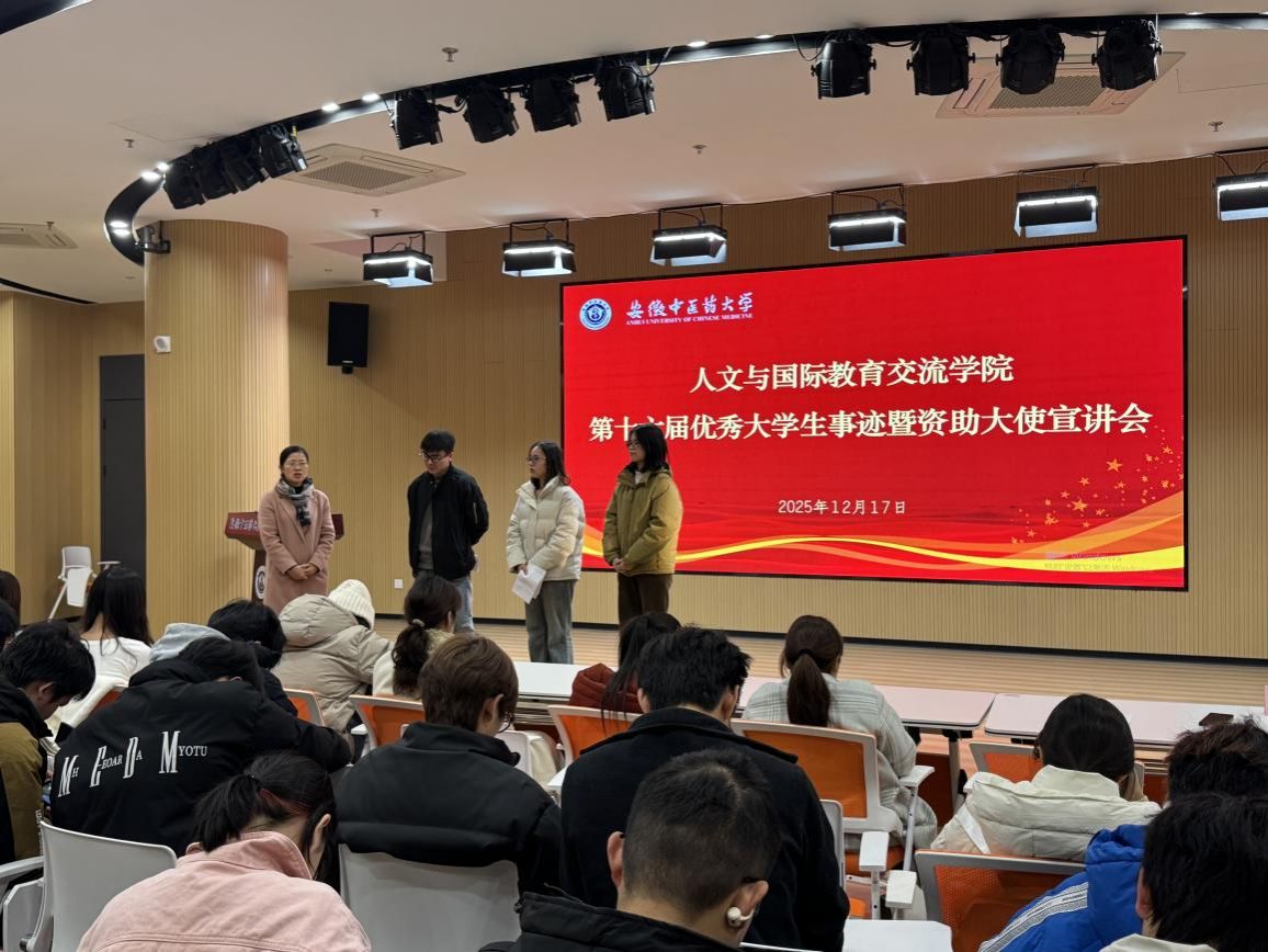 为发挥榜样示范引领作用,传递自立自强、励志成才的精神力量,进一步推动资助育人工作走深走实,12 月 17 日,人文与国际教育交流学院在学校“一站式岐黄社区” 路演大厅成功举办第十六届优秀大学生事迹暨“精诚资助大使”宣讲会。学院党总支副书记顾义俊主持会议,学院新生辅导员、优秀学生代表及 2025 级全体本科生、硕士生新生参加本次活动。