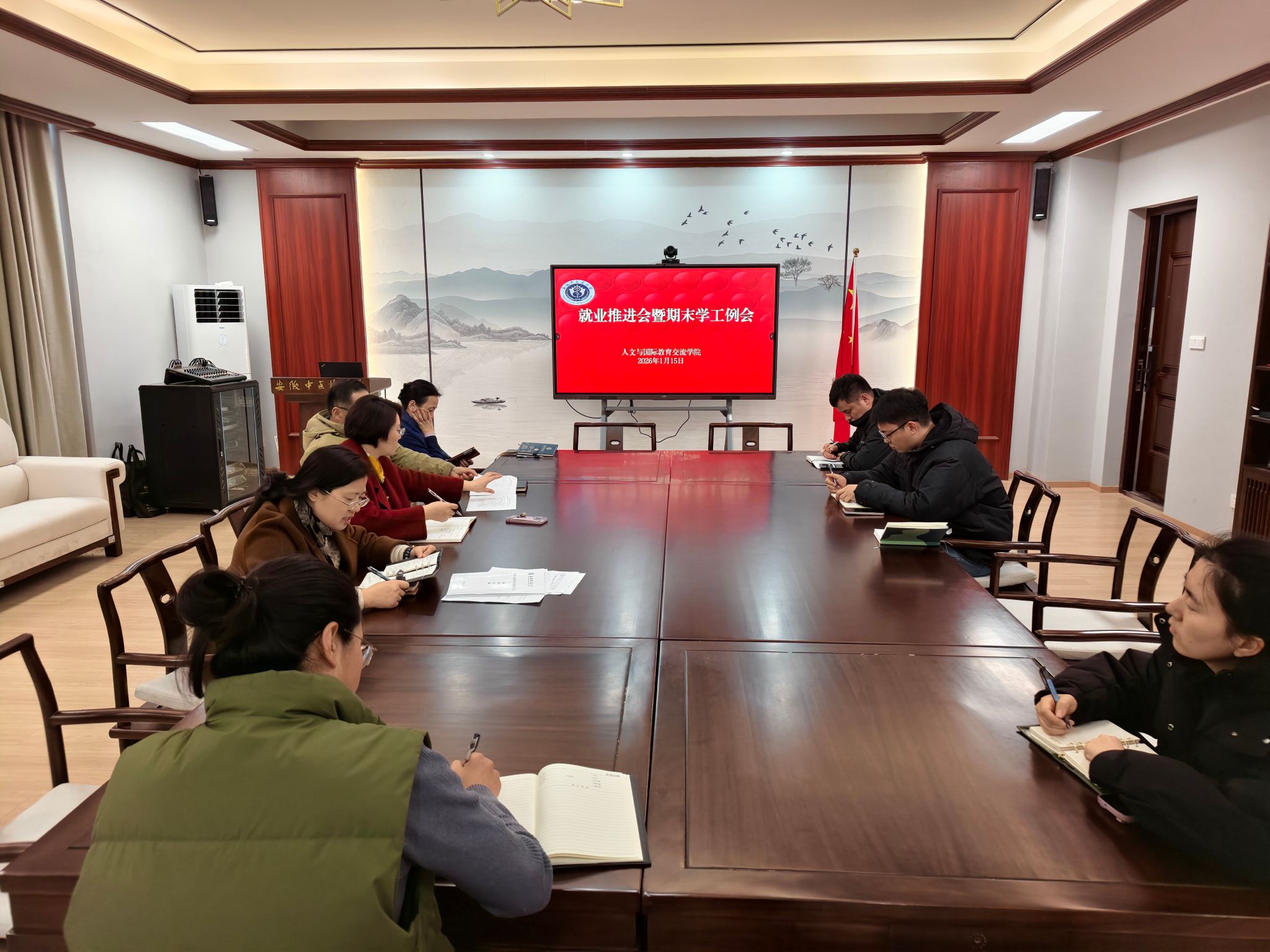 1月15日下午,人文与国际教育交流学院召开就业推进会暨期末学生工作例会,深入学习贯彻学校相关会议精神,全面分析当前学生工作与就业形势,明确并部署下一阶段重点任务,为学院学生工作有序开展筑牢基础。学院党政领导班子成员、辅导员参加会议。会议由学院党总支副书记顾义俊主持。