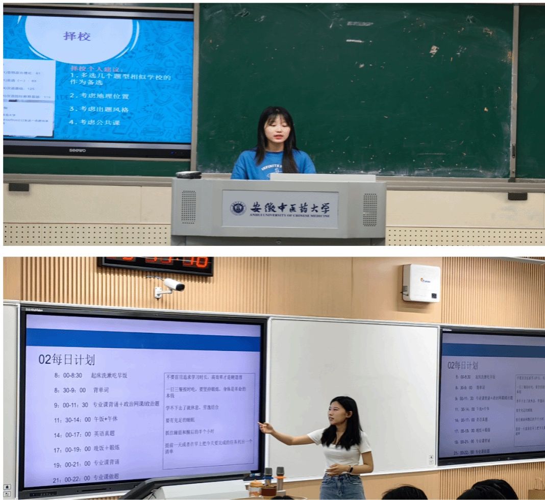 在经验分享环节,8位优秀学长分别围绕考研学校选择、备考计划制定、复习方法与技巧、考研心态调适、考研调剂等方面做了细致的分享。分享结束后,2024届所有考验上岸的毕业生分成小组,以会场的形式,与学弟学妹们进行深层次的分析交流。
