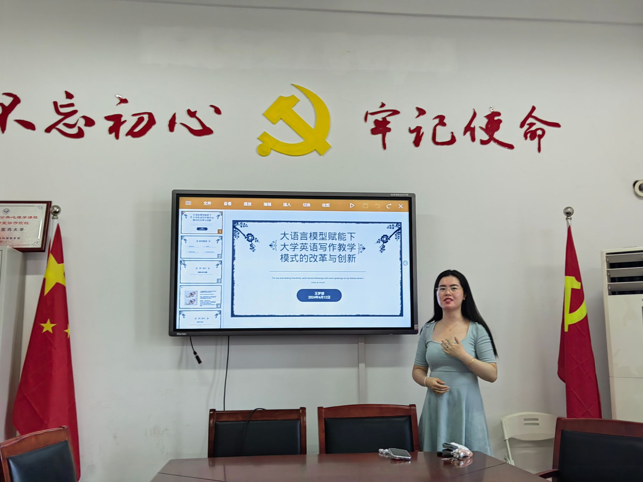 6月12日下午,人文与国际教育交流学院教工第一党支部、教工第四党支部联合开展党员活动,举办了医学人文论坛第50期学术沙龙。本次学术沙龙的主题为“大语言模型赋能下大学英语写作教学模式的改革与创新”,由中医药国际传播系教师王梦婕主讲,参与者为外语系和中医药国际传播系教师。