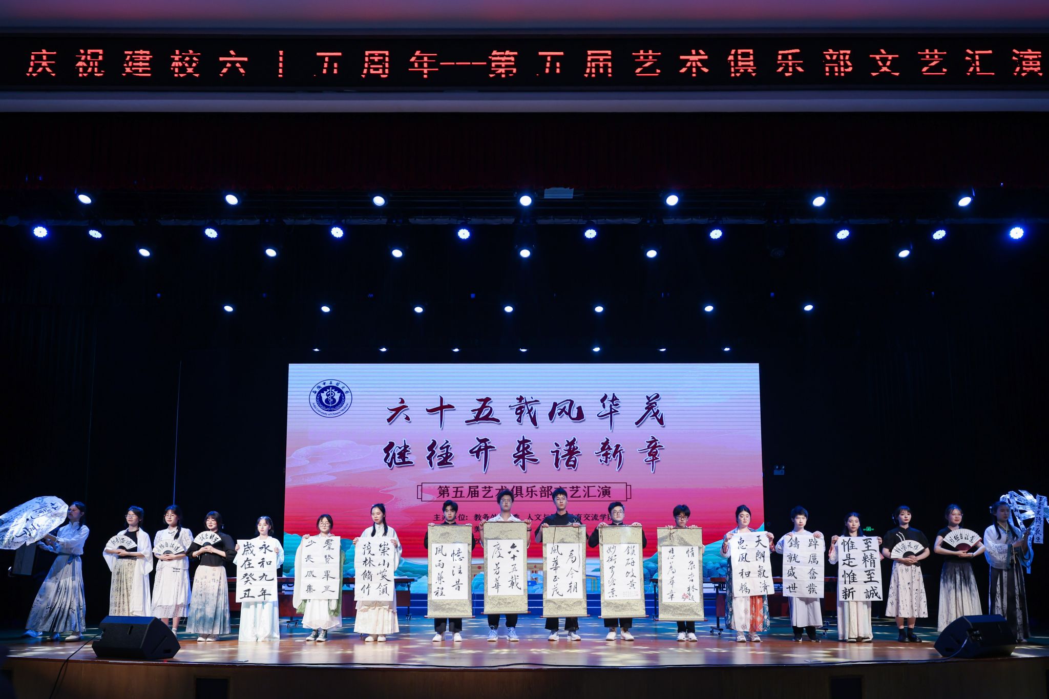 本次文艺汇演由教务处、校团委、人文与国际教育交流学院共同主办,人文与国际教育交流学院美育中心具体承办。演出节目从书法俱乐部、绘画俱乐部、戏曲俱乐部、器乐俱乐部、K歌俱乐部、合唱俱乐部、话剧俱乐部、朗读者俱乐部、舞蹈俱乐部中选出。整场演出以庆祝建校六十五周年为主题,沉浸式美育展演复刻文化经典,话剧表演《雷雨》,剧情扣人心弦,引人入胜;留学生经典诵读《神医华佗诵》,将中医药文化潜移默化融入教学实践;书法走秀《兰亭墨韵》,以朗诵+书法+走秀的形式传承书法中的人文精神。还有《秋瑾》《九州同》《我心中的红》等作品精彩纷呈,洋溢着安中学子青春的气息,展示了安中学子青春的力量。