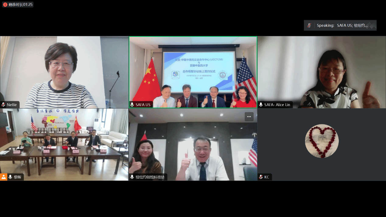 2024年7月8日,我校与美国-中国中医药交流合作中心在线上举行合作框架协议签约仪式。学校校长许钒、美国-中国中医药交流合作中心董事长张锦平先生、中国驻纽约总领馆科技参赞侯立宏、中国驻纽约总领馆科技领事王赛歌、美国-中国中医药交流合作中心临床医疗总监李旭辉、世界中医药学会针灸学会联合会副主席 美国-中国中医药交流合作中心专家委员会共同主席林榕生、美国-中国中医药交流合作中心专家委员会执委哈佛大学医学院丹娜法博癌症中心主任包婷等参加签约仪式。学校外事办公室主任周亚东、副主任昂文平等一同参加签约仪式。
