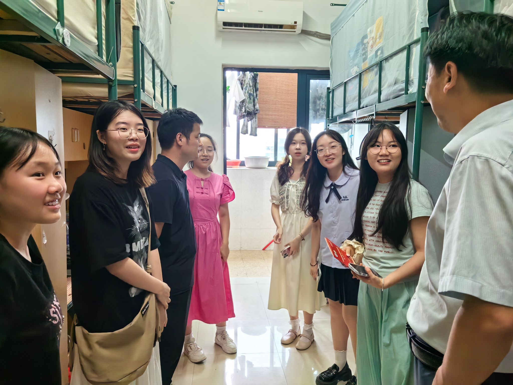 为深入了解学院2024级新生开学阶段的思想状态和适应情况,加强师生之间的沟通与联系,帮助新生们更好更快地融入新集体与新环境,9月6日下午,人文与国际教育交流学院党总支书记金晓琴、副书记彭青和、副院长昂文平带领学院辅导员们走进新生宿舍,与同学们“拉家常、聊近况、话学业”,送上来自人文学院的第一份温暖和关怀。