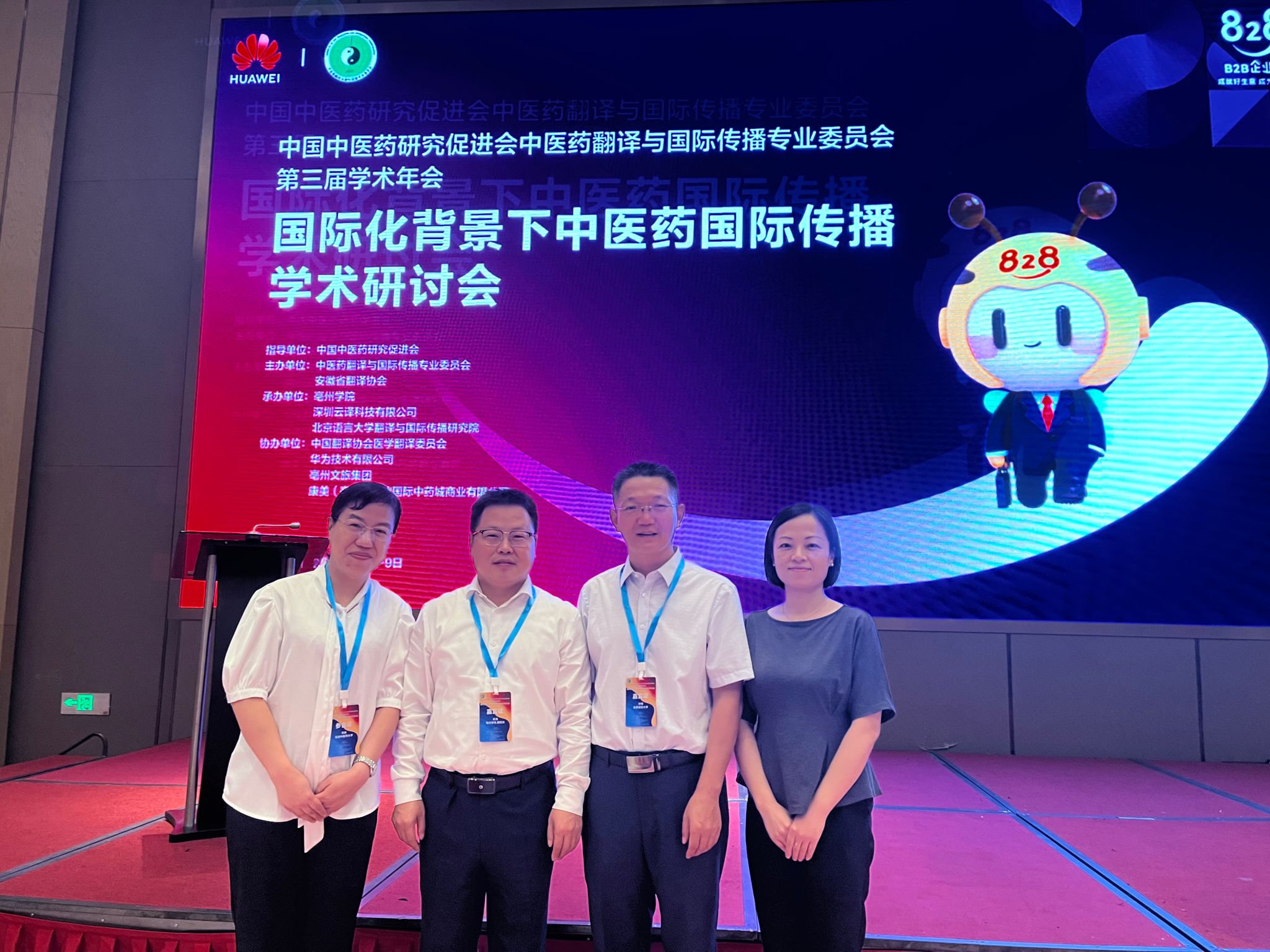 9月6日至9日,中国中医药研究促进会中医药翻译与国际传播专业委员会第三届年会暨国际化背景下中医药国际传播学术研讨会在安徽亳州举办。会议由中国中医药研究促进会中医药翻译与国际传播专业委员会和安徽省翻译协会主办,亳州学院、深圳云译科技有限公司和北京语言大学翻译与国际传播研究院承办,亳州市委相关领导出席开幕式,来自清华大学、北京中医药大学、北京语言大学、广州外语外贸大学等高校的百余名专家学者参加盛会。我校人文与国际教育交流学院党总支书记金晓琴、外语系李静老师应邀参加大会,李静作分论坛报告。