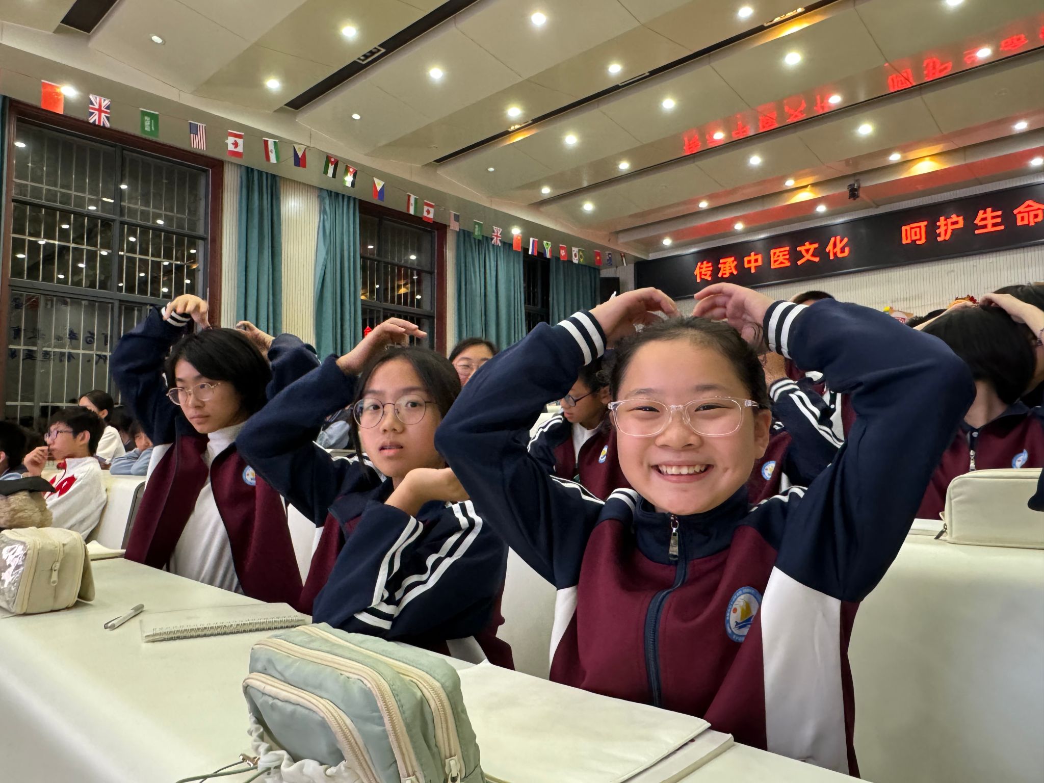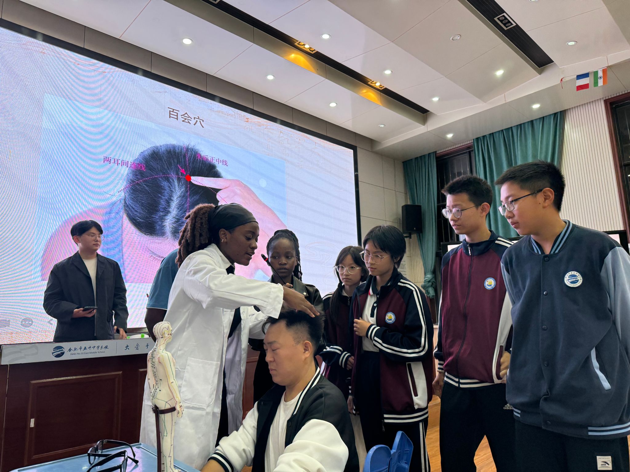 潘银星多年来专注于中医药国际化,坚持“用英语讲好中国故事,向世界传播中医文化”,用双语讲述的中医治疗失眠、焦虑和亚健康调理的短视频深受欢迎。讲座中,潘银星从考试紧张焦虑怎么办、上课时注意力不集中、如何提高记忆力等中学生常见的问题,用英语向同学们详细介绍了神门穴、安眠穴、内关穴、百会穴和四神聪的位置和功效。为了激发孩子们的学习兴趣,他寓教于乐,带领留学生通过情景演绎的方式,生动形象地介绍了各个穴位,并邀请同学们上台体验交流,用英语介绍穴位,现场气氛活跃,孩子们纷纷动手寻找自己的对症神“穴”,感叹中医的神奇。