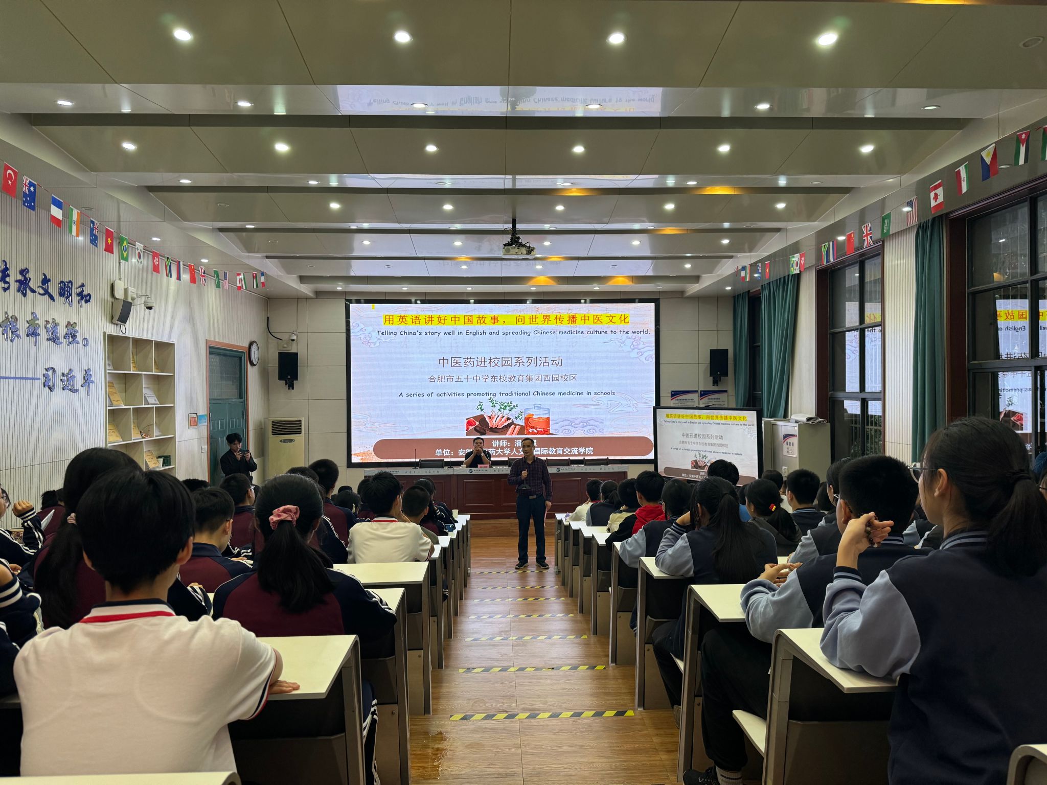 为弘扬中华优秀传统文化,让中医学服务更多人群,激发中小学生对中医药学和英语学习的兴趣,10月15日下午,人文与国际教育学院潘银星老师及留学生同学们受邀赴合肥市五十中学东校教育集团西园校区,精心策划了一场题为“传承中医文化,呵护生命健康”的特色讲座。学院党总支书记金晓琴参加活动,西园校区第一党支部副书记、德育主任宋奇香主持讲座。