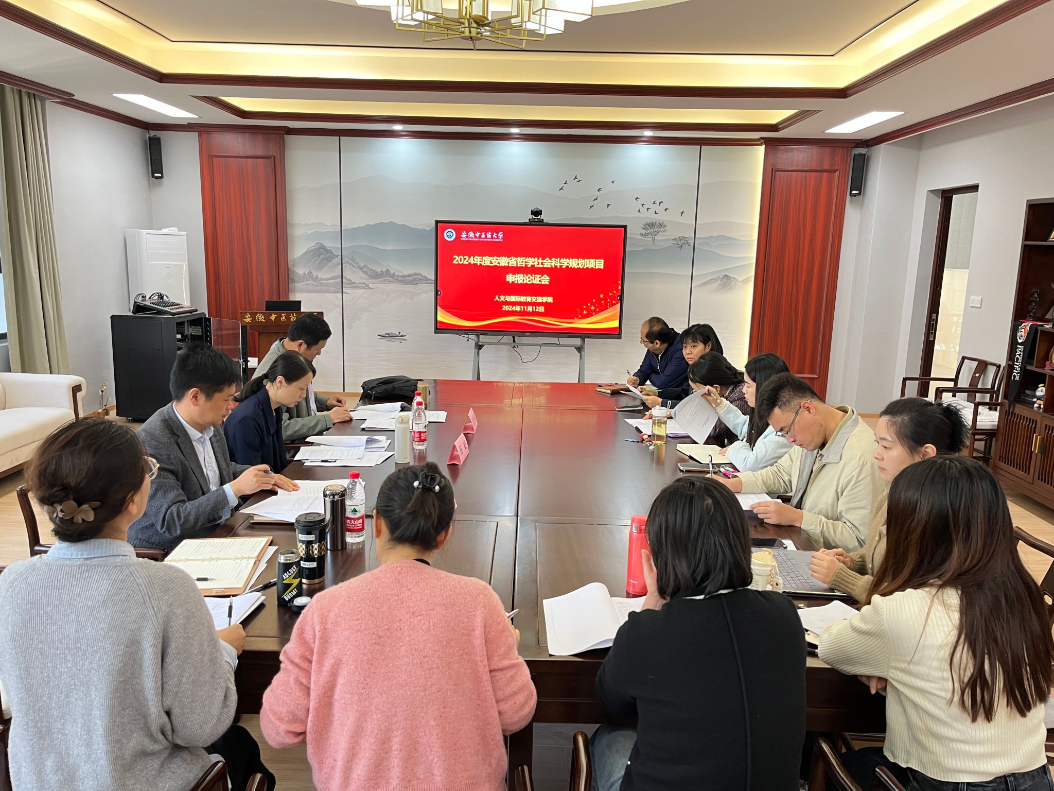 11月12日上午,人文与国际教育交流学院在292会议室召开2024年安徽省哲学社会科学规划项目申报论证会。会议邀请安徽大学哲学学院副院长侯娟教授和学校教学督导尤吾兵教授对申报标书进行一对一指导,学院参与申报项目的相关教师参加论证会,会议由副院长张筱荣主持。