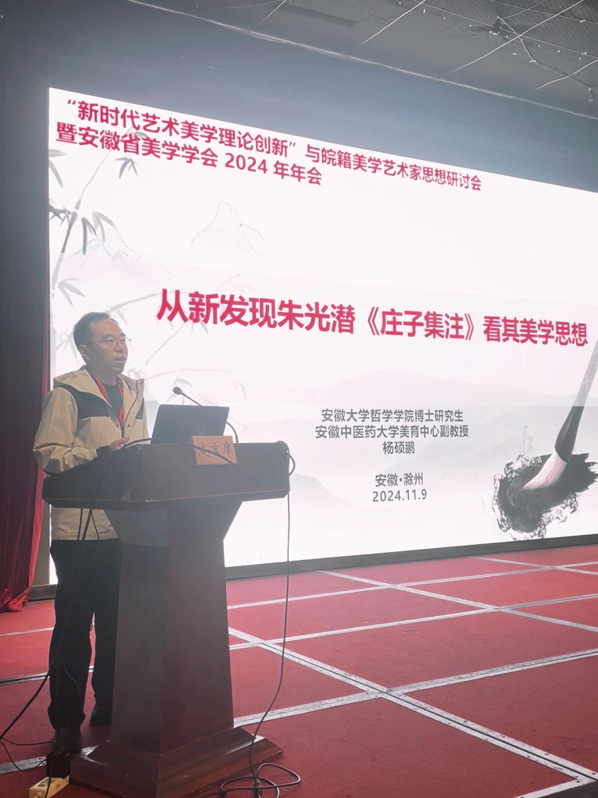 会上,人文与国际教育交流学院美育中心杨硕鹏副教授以“从新发现朱光潜《庄子集注》看其美学思想” 为题做大会主旨报告,详细解读了朱光潜何以在1948年底读《庄子》,朱光潜《庄子集注》在中西互为体用的比较方法中相互发明,融合西方美学理论与接桐城文脉一线之传的文化自觉于一体,新发现的朱光潜《庄子集注》为深入研究先生美学思想和中国传统美学现代化提供了新的视角和资料。