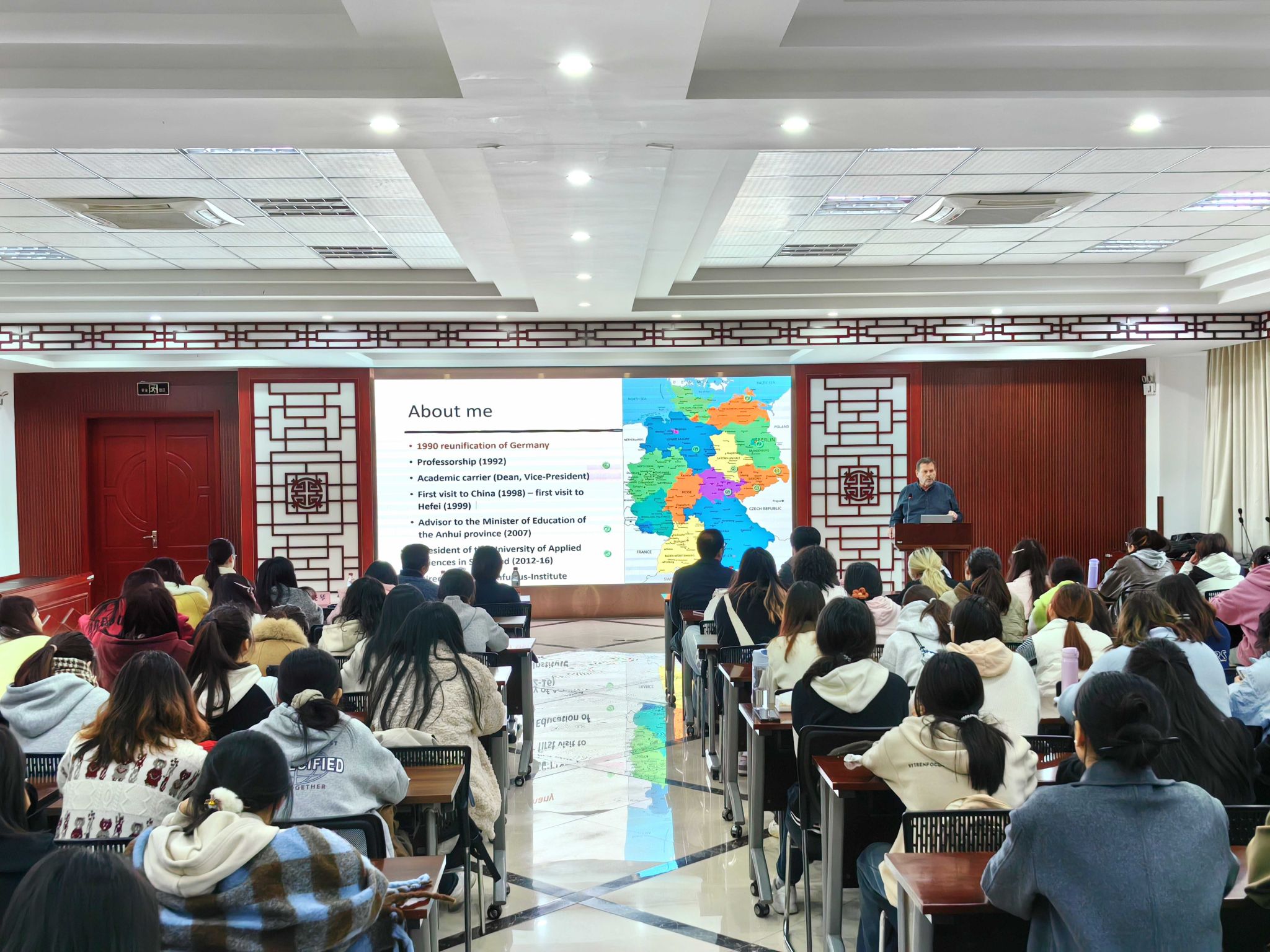 为进一步拓展学生的国际视野,促进学术研究中的跨文化交流,11月19日,人文与国际教育交流学院邀请德国施特拉尔松德应用科学大学法尔克·霍恩教授作主题为“从西方的角度看中国文化和传统价值”的学术报告,学院党政领导、中医药国际传播系潘银星老师、中医文化学研究生以及2022级、2023级汉语国际教育专业本科生参加了报告会,会议由院长周亚东和潘银星老师共同主持。