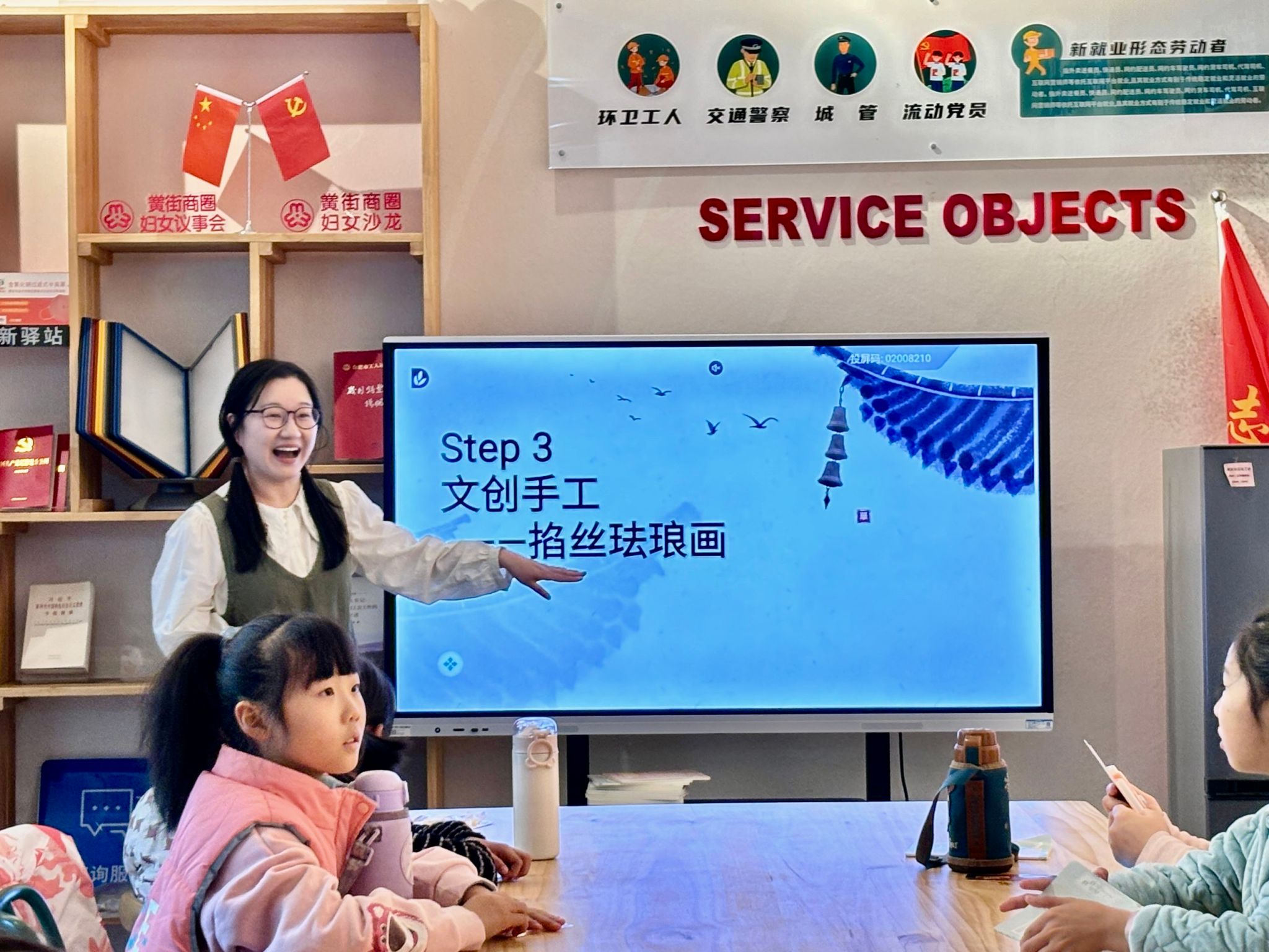 活动以英语为媒介,让孩子们在乐趣中探索非遗文化。在导览讲解环节,孩子们学习如何用英语探索非遗的根源;在DIY环节,孩子们亲手制作掐丝珐琅画,既锻炼了动手能力,也加深了对非遗文化的理解。现场孩子们热情参与,气氛活跃,教师们的耐心指导和有效答疑赢得了广泛赞誉。