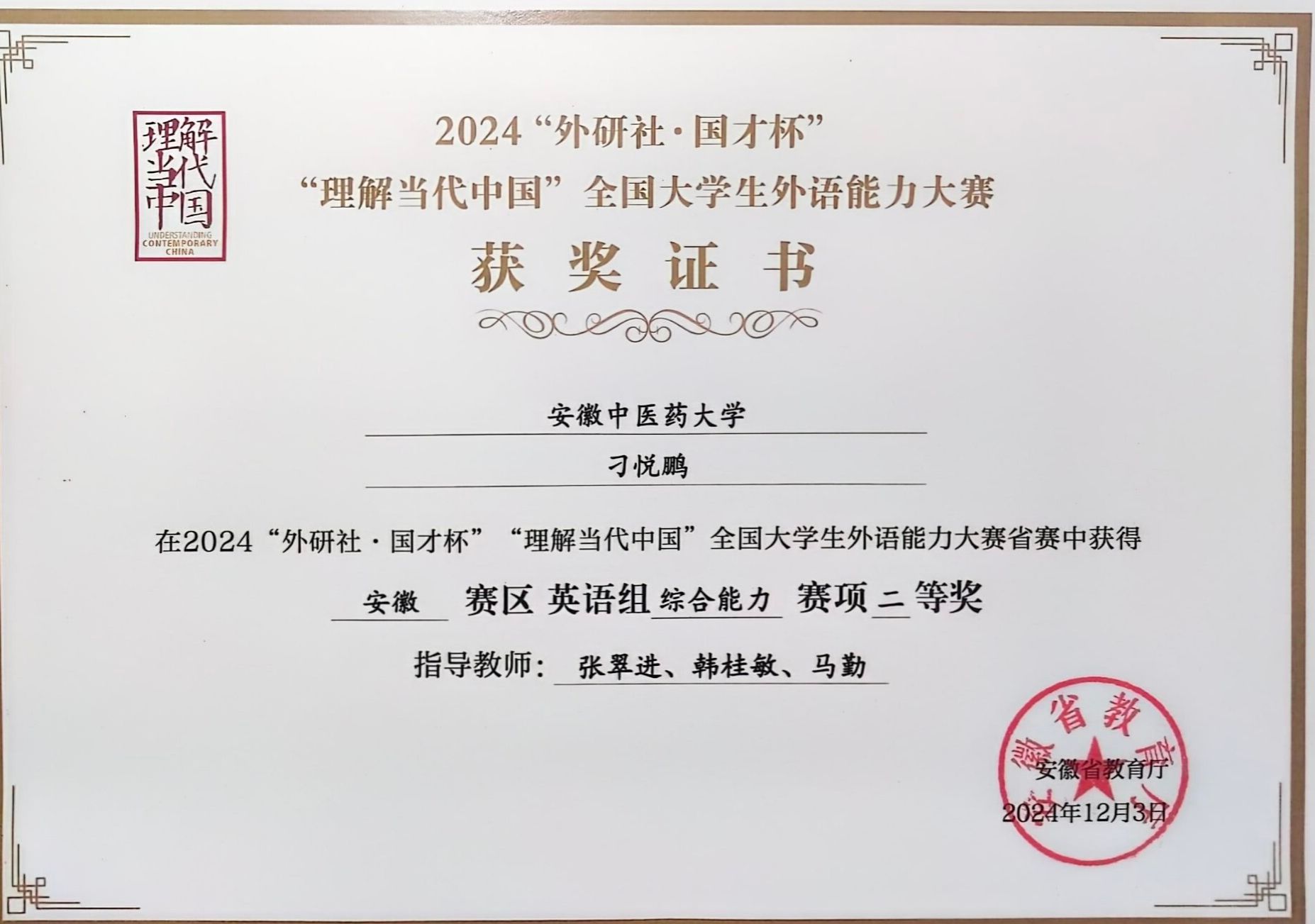 近日,安徽省教育厅公布2024“外研社·国才杯”“理解当代中国”全国大学生外语能力大赛(安徽赛区)获奖名单。本次大赛安徽赛区设置演讲、口译、笔译、短视频及综合能力等多个赛项,共有来自省内47所高校的500多名选手参加本次比赛。