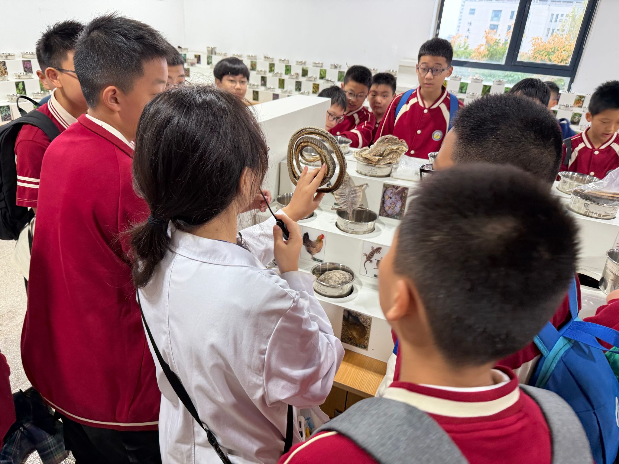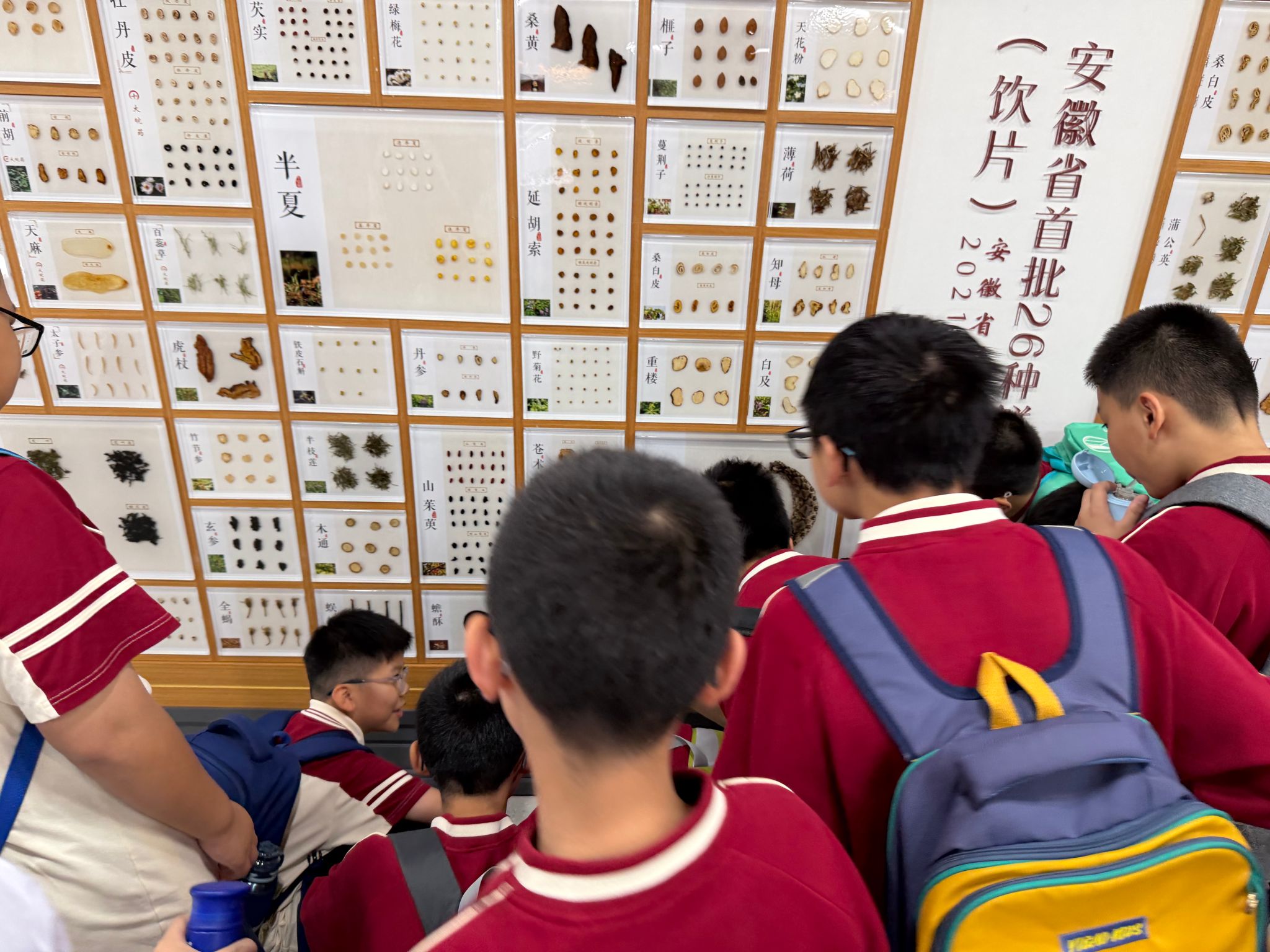 在专业讲解员引导下,同学们依次参观中药材性状辨识馆、安徽道地药材研展馆、本草研展馆等六个专题展室。馆内珍藏的千余份药材标本以及数百种道地药材和浸制标本,令同学们目不暇接。“这个植物我在路边见过,竟然是中药!”“药材原来有这么多形态!”大家一边聆听讲解,一边踊跃发问,在互动中深入了解了中药的辨识、炮制与临床应用。