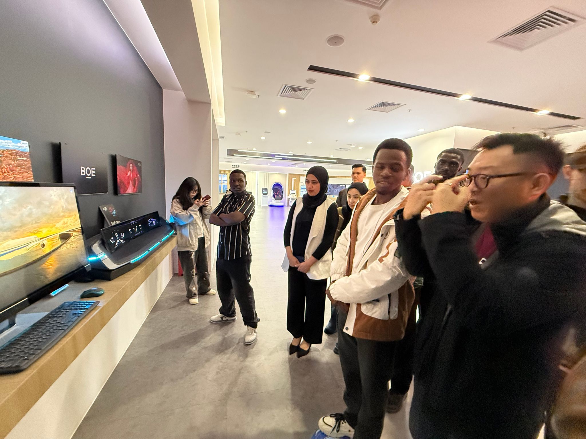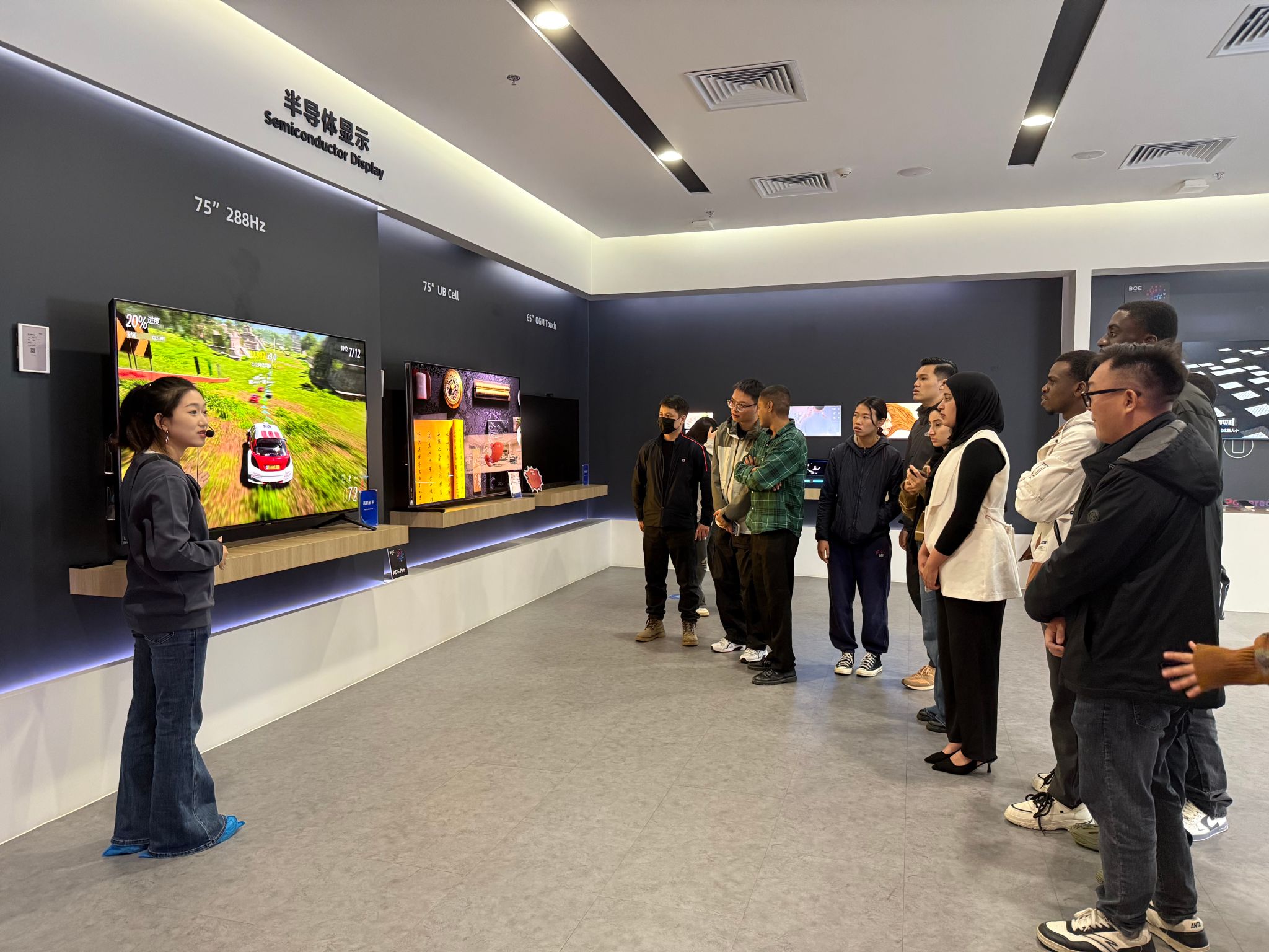 师生一行参观了站北社区招商奥体社群之家,开展"留学英才探站北"屏显产业链考察活动,实地参观了合肥京东方显示技术有限公司展厅和合肥欣奕华智能机器股份有限公司,详细了解屏显产业的前沿技术与发展现状。来自马来西亚的陈冠宇同学表示:“我对如今中国机械设备的快速和精准程度感到非常震撼。这完全不同于我在外国媒体上看到的水平。这是一次非常棒的体验”。来自摩洛哥的木兰同学认为,“这次参观对我来说是一个很好的机会,因为有些东西是我第一次见到的,能够亲眼看到并近距离了解这些高科技产品,真是太棒了,非常有意义”。