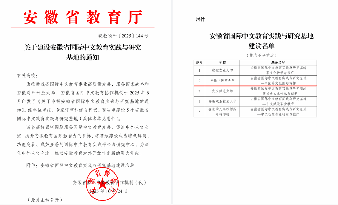 近日,安徽省教育厅印发《关于建设安徽省国际中文教育实践与研究基地的通知》,由学校人文与国际教育交流学院(外事办、港澳台办)牵头申报的“安徽省国际中文教育实践与研究基地——中医药文化国际传播”成功获批。