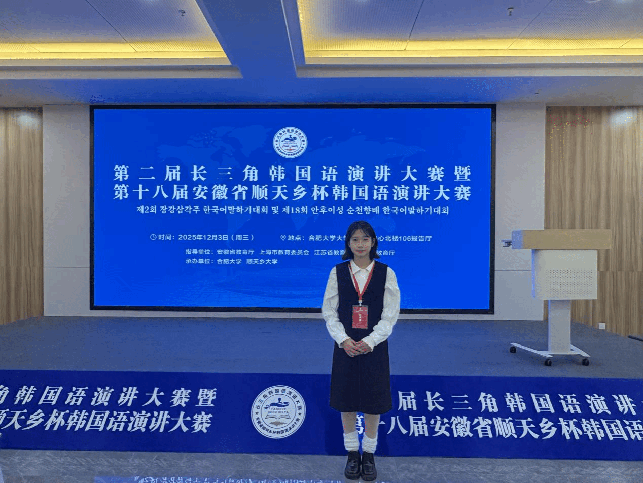 12月3日,第二届长三角韩国语演讲大赛暨第十八届安徽省顺天乡杯韩国语演讲大赛决赛在合肥大学落幕。我校2022级中西医结合专业学生杨莉荣获大赛铜奖。