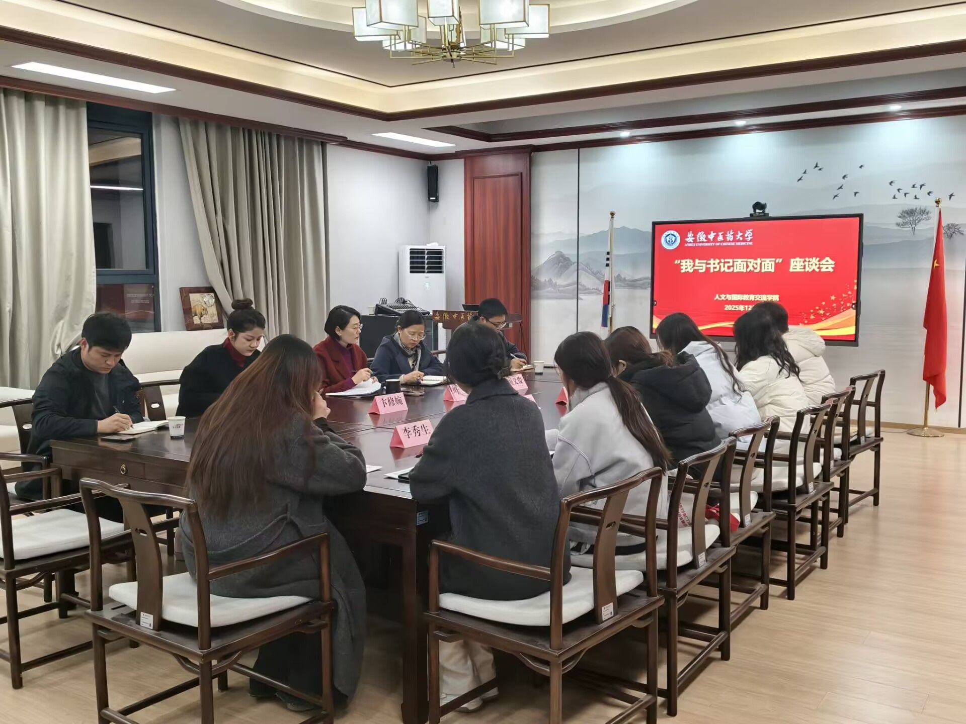 12月3日晚,人文与国际教育交流学院召开“我与书记面对面”暨学生干部座谈会,倾听学生呼声,共话成长成才。学院党总支书记叶兰兰、副书记顾义俊,分团委、学生辅导员以及学院新一届团委委员、各学生组织主要负责人参会,座谈会由顾义俊主持。