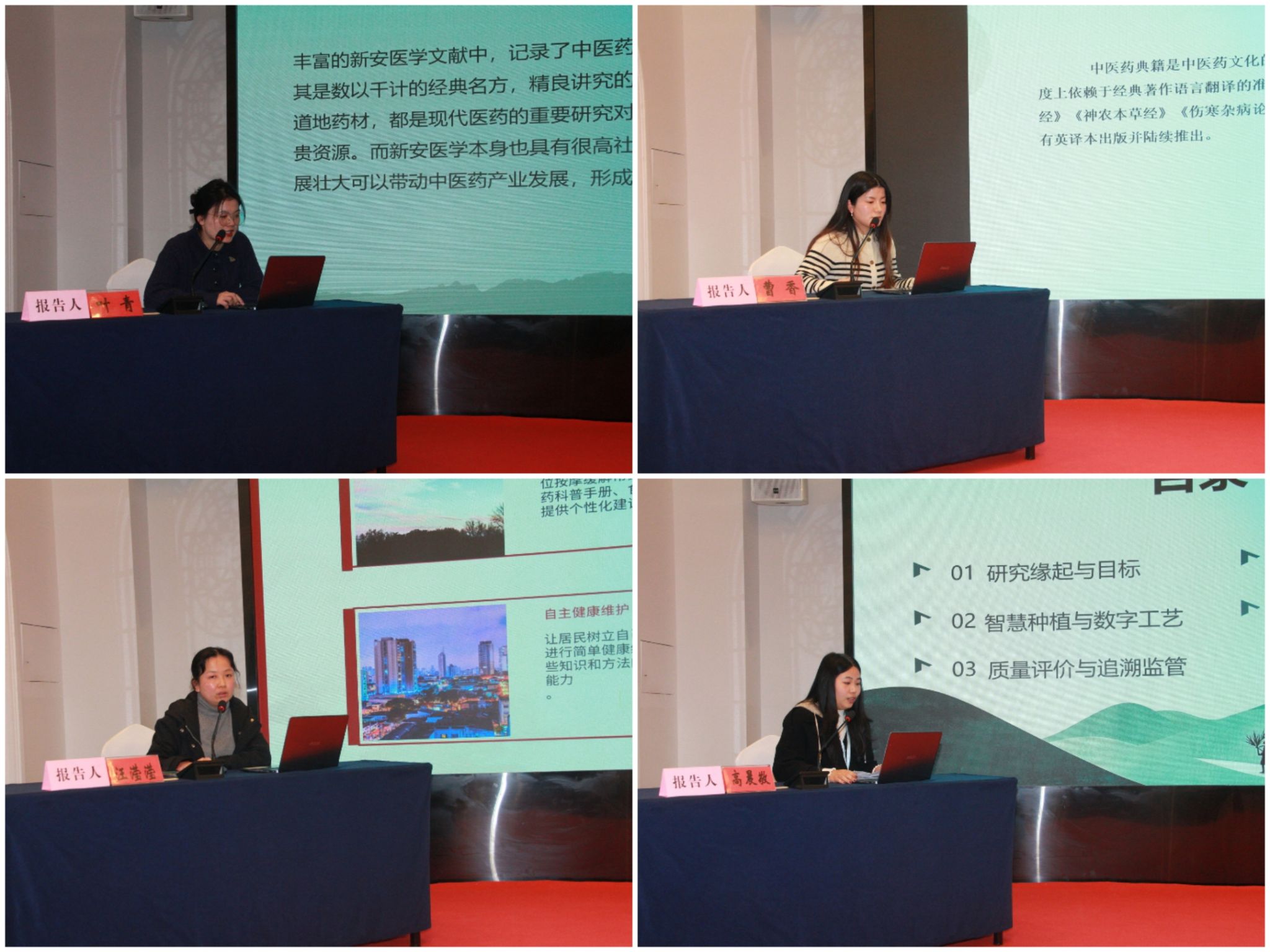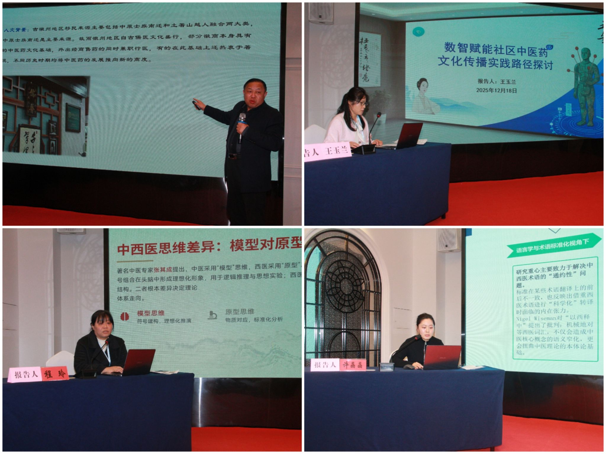 本次会议的主题为“人工智能赋能中医药文化传承创新发展”。朋汤义作《徽派中药炮制——理论解析与传承创新》,王玉兰作《数智赋能社区中医药文化传播路径探讨》,程玲作《广义符号学视角下的中医模型特征研究》,许晶晶作《跨文化语境下中医典籍翻译的修辞困境与文化主体性重构》,叶青作《新安医学当代传承与文化弘扬》,曹香作《国际传播视角下中医药典籍术语的英译问题与对策研究》,汪滢滢作《中医药服务进万家》,高晨敬作《构建数据驱动的“十大皖药”智慧品质保障体系》等大会学术交流发言。