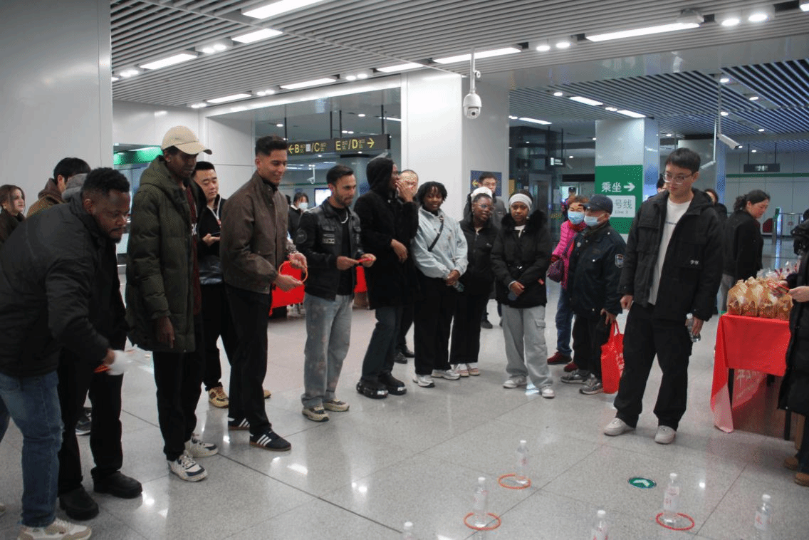 活动开始前,地铁工作人员带领国际学生参观了地铁控制室及站内区域。通过实地观察与工作人员的讲解,同学们对地铁的运营模式有了更为直观且深入的认识。活动中,留学生们在工作人员引导下有序领取套圈,积极参与现场互动游戏。大家站在投掷线前专注投掷,在轻松愉快的氛围中体验中国传统游艺乐趣,并通过互动进一步了解合肥本地公共交通文化。