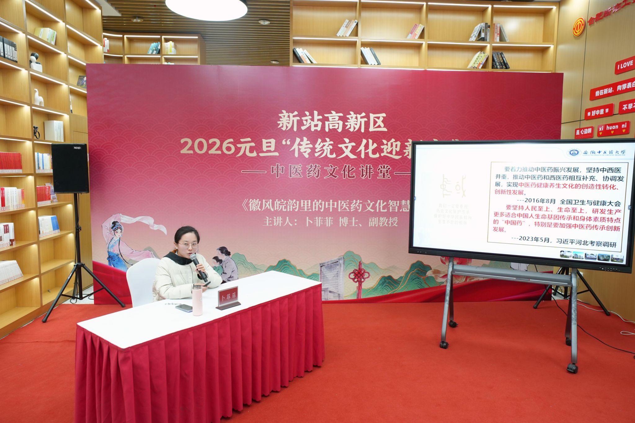 人文与国际教育交流学院院长周亚东教授受邀面向新站高新区职工主讲《让中医养生融入百姓日常生活》健康讲座。他以通俗易懂的语言,从中医“治未病”的理念入手,讲解了中医养生的基本原则和日常方法。汉语国际教育系卜菲菲副教授受邀主讲《皖风徽韵中的中医药文化智慧》,深入浅出的解读了中医药文化的内涵与外延、“南新安 北华佗”安徽中医药文化及实践范例。