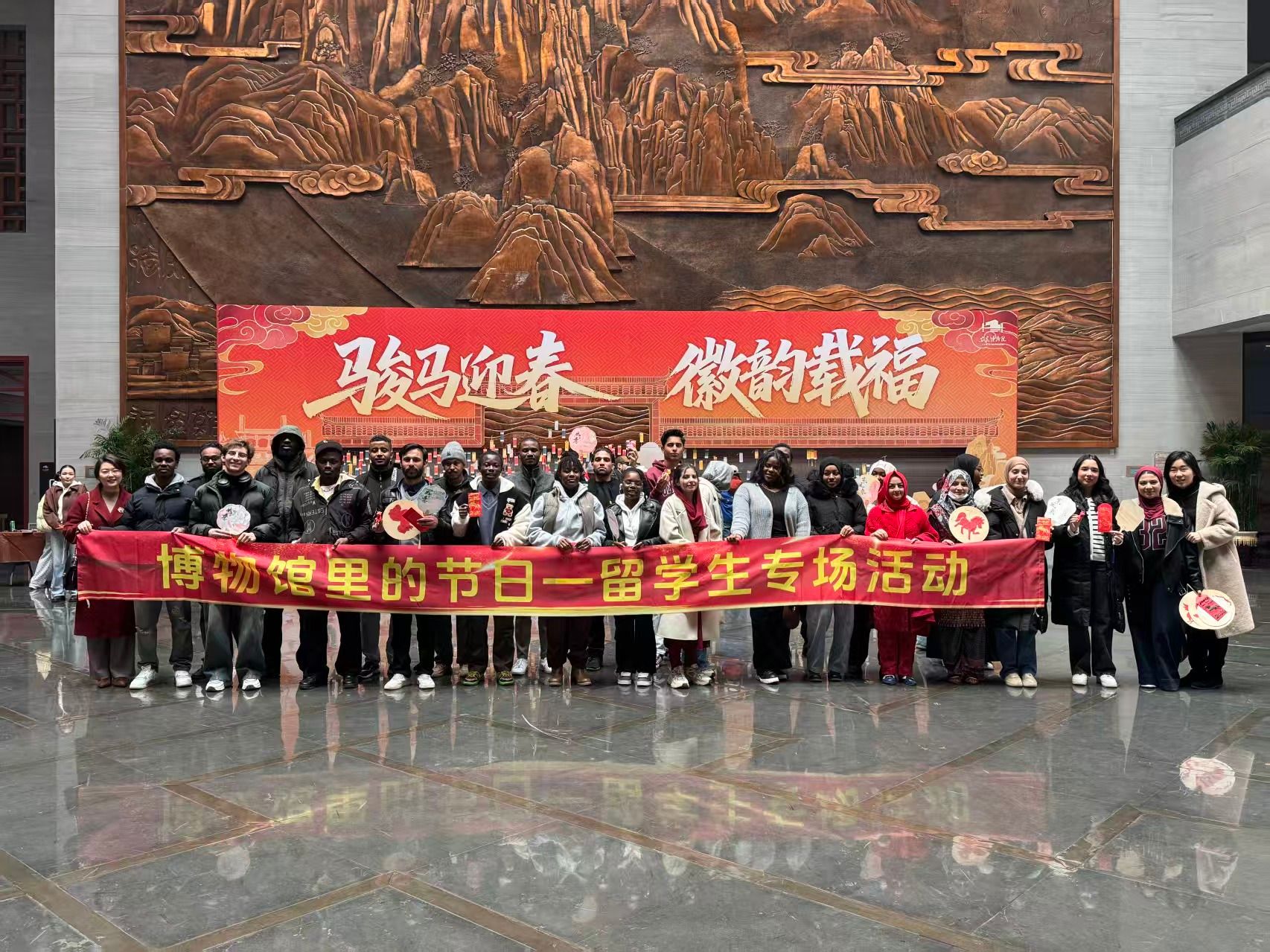 笑语漫过徽派古建青瓦,红纸裁来马岁新春吉祥。2 月 17 日,中国农历大年初一之际,我校组织来自阿富汗、摩洛哥、坦桑尼亚等国的近50名春节留校国际学生走进安徽省博物院,沉浸式体验了安徽历史的厚重底蕴与中国年俗的独特魅力,在博物馆里度过了一个意义非凡的新春佳节。