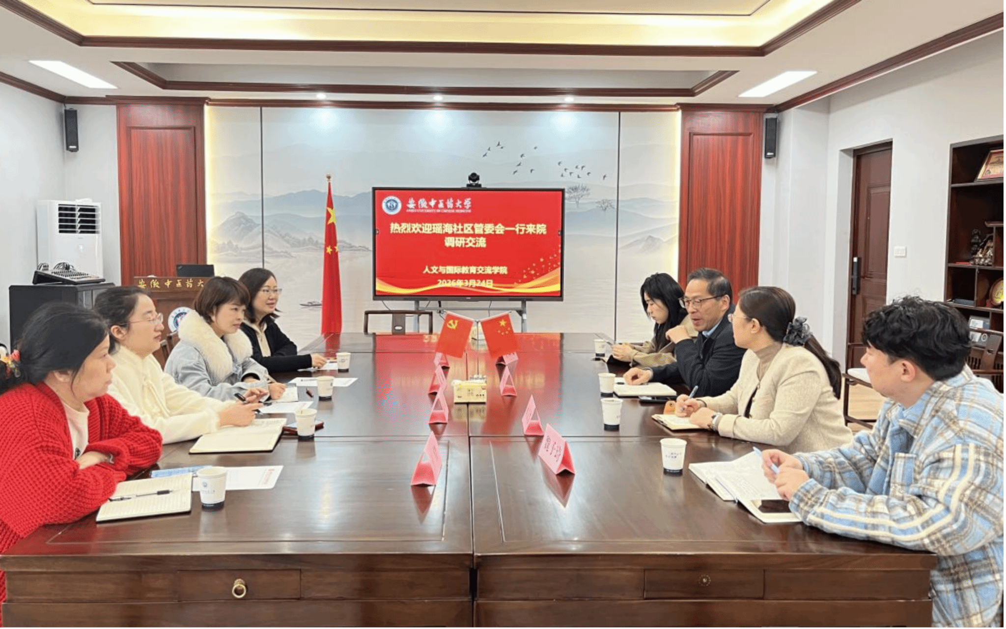 3月24日上午,瑶海社区管委会主任姜颖,副主任郑媞,社区党群服务中心副主任汪倩一行莅临人文与国际教育交流学院开展调研交流,双方围绕校社共建、文化传播、资源共享等方面展开深入探讨。学院院长周亚东、党总支副书记顾义俊及相关科室负责老师参与本次交流会议。