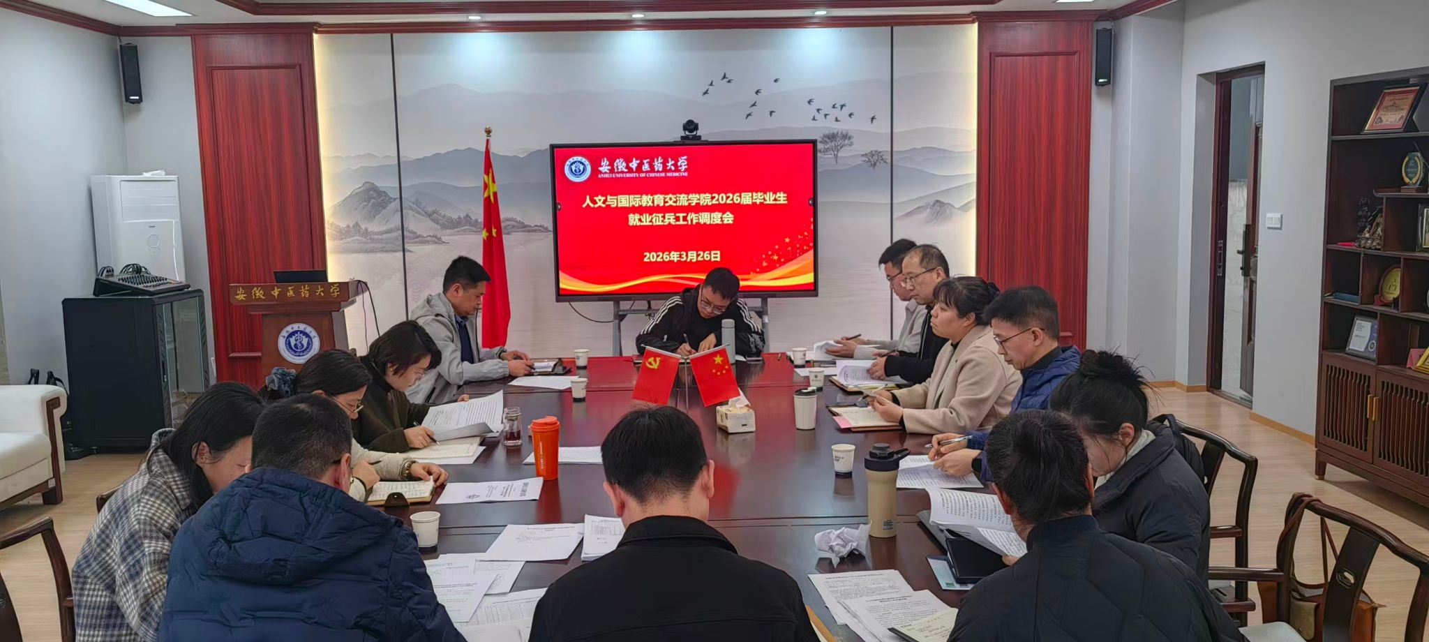 3月26日下午,人文与国际教育交流学院在惟新楼292会议室召开2026届毕业生就业征兵工作调度会。学院领导班子、党总支委员、党支部书记、系主任、全体毕业班辅导员参加会议,学院党总支副书记顾义俊主持会议。