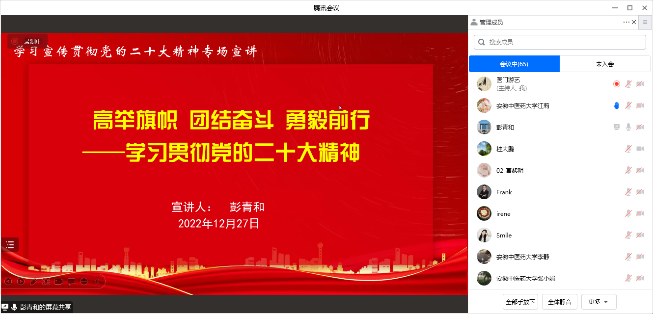为深入学习宣传贯彻党的二十大精神,推进党的二十大精神入耳入脑入心,人文与国际教育交流学院特邀学校理论宣讲团成员、医药经济管理学院党委副书记彭青和老师为全院教师宣讲党的二十大精神。宣讲会以线上方式进行,由学院党总支副书记桂大鹏主持。