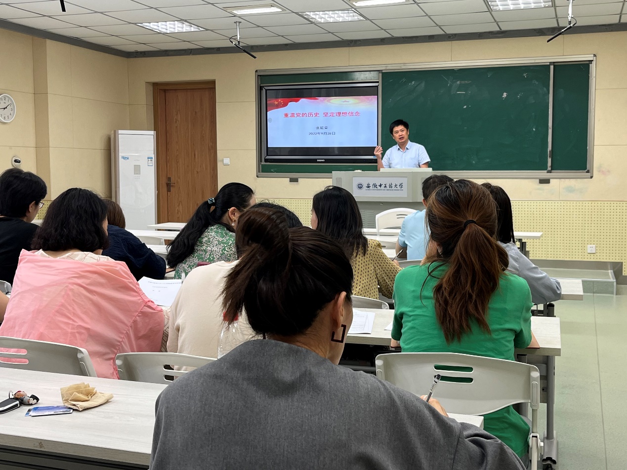 为庆祝中国共产党成立101周年,迎接党的二十大胜利召开,按照学校党组部署,结合领导班子带头讲党课等专项要求,9月28日下午,人文与国际教育交流学院党总支在学院376教室开展“重温党的历史,坚定理想信念”专题党课。党课由学院副院长张筱荣讲授。全体教师党员、部分学生党员代表参加学习。