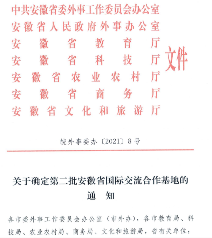 近日,中共安徽省委外事工作委员会办公室、省政府外事办公室、教育厅、科技厅、文化旅游厅等七部门联合下发《关于确定第二批安徽省国际交流合作基地的通知》(皖外事委办﹝2021﹞8号)。经过各高校申报,经省教育厅评审推荐,省外事办组织专家评审、现场考察等程序,我校获批第二批安徽省国际交流合作基地。