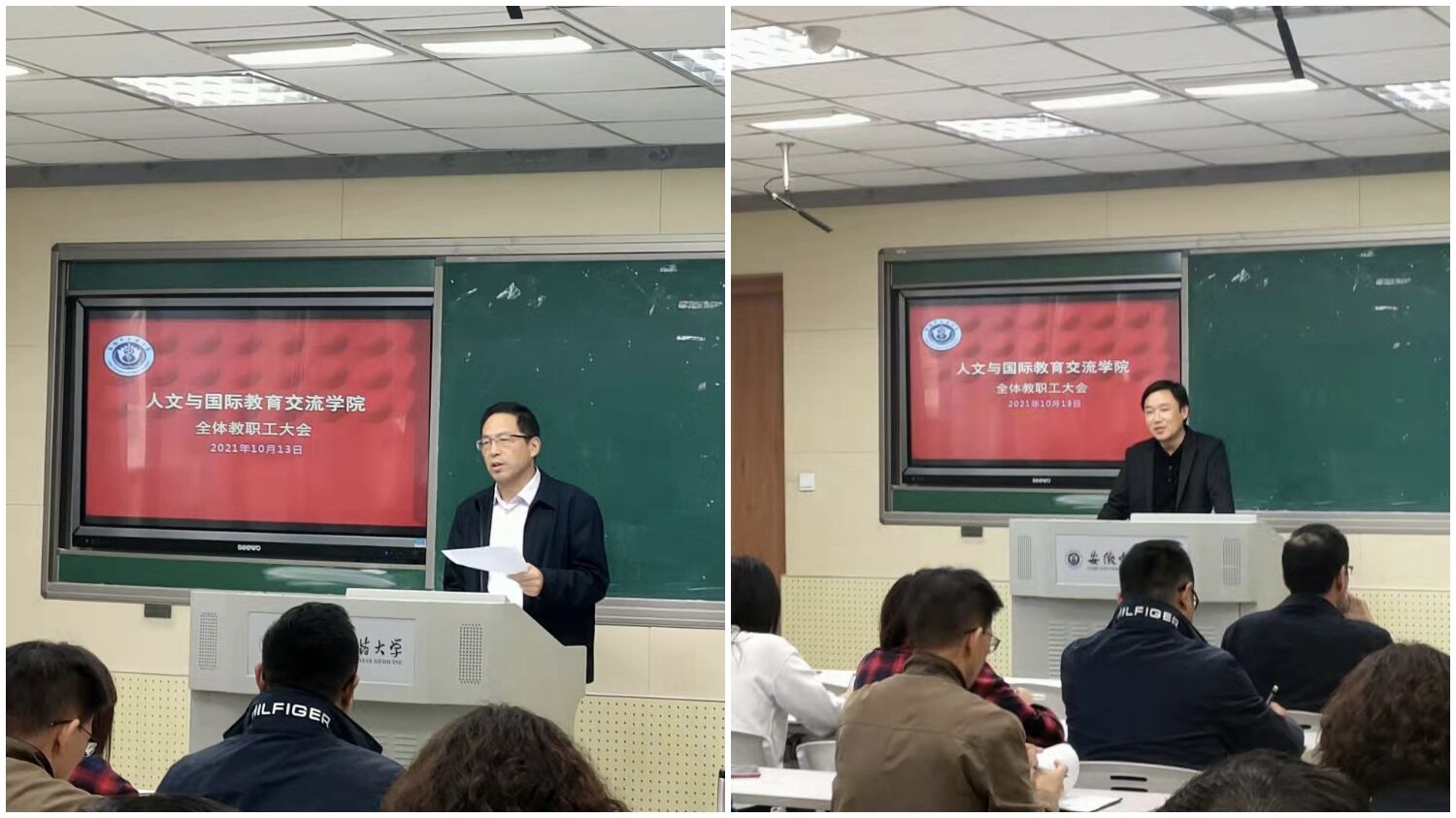 10月13日,人文与国际教育交流学院召开全体教职工大会。学院党政领导班子成员出席会议,全体教职工参加会议,会议由学院书记姚为久主持。