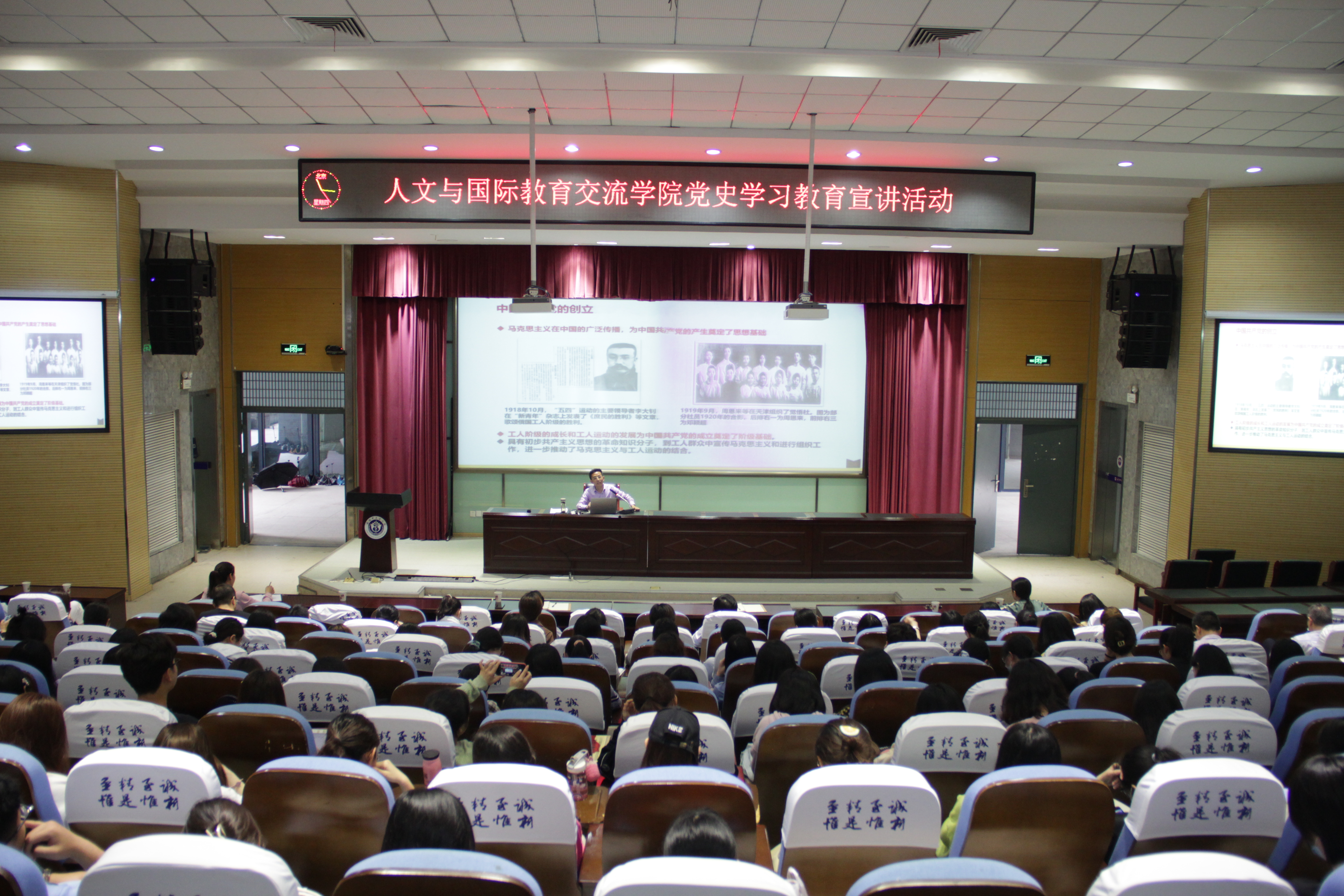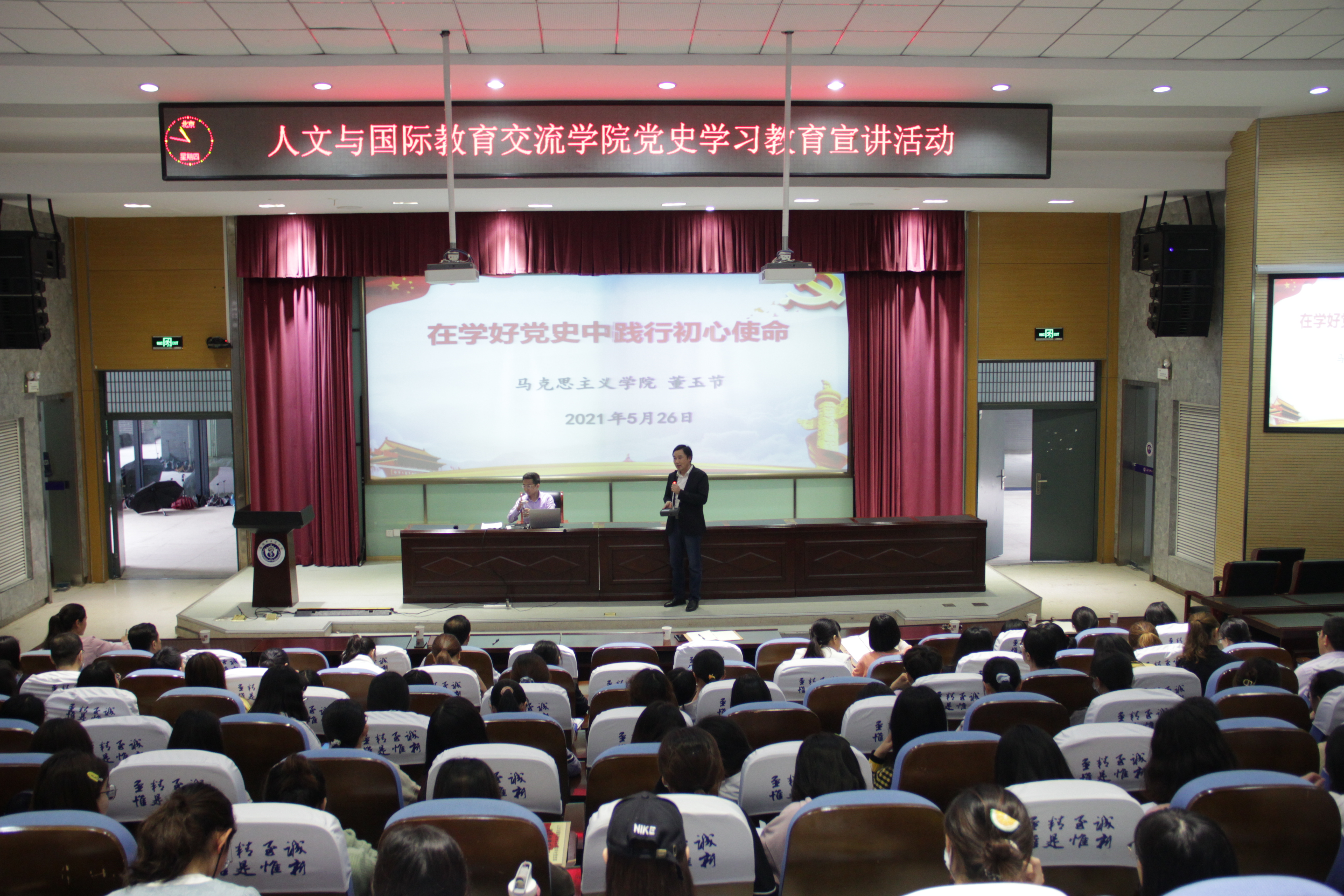 根据学校党史学习教育总体部署,5月26日下午,人文与国际教育交流学院邀请“安徽中医药大学理论宣讲团”成员、马克思主义学院董玉节教授作专题报告,学院全体党员、入党积极分子共206人参加了报告会。学院党总支书记姚为久主持了报告会。