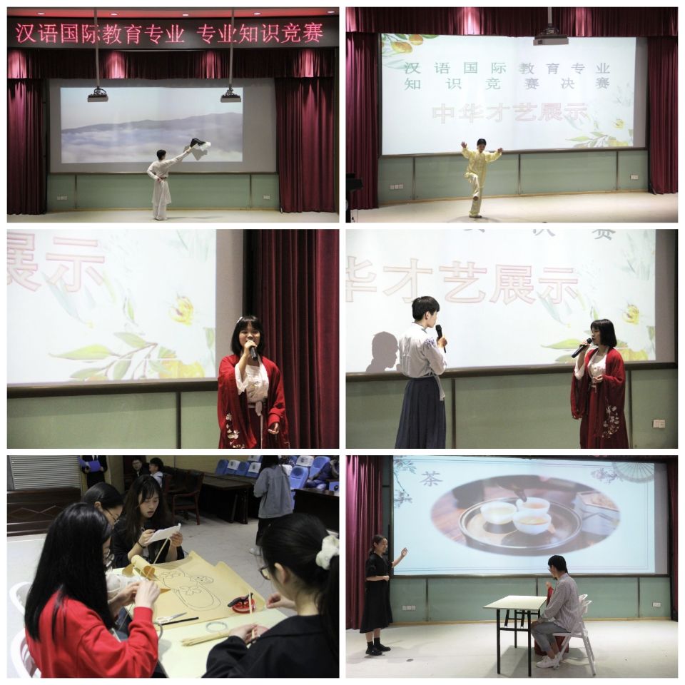 来自三个年级的四支代表队过关斩将闯入决赛,他们团结合作,相互配合,在团队必答题环节稳步得分;他们学以致用,临场应变,在抢答题环节积极抢分,他们深思熟虑,积极应对,在风险题环节再创高分。怀唱一曲《庐州月》,跳动一支扇子舞,踢打一套五禽戏,手作一袭风纸鸢,各队选手在中华才艺展示环节轮番献上精彩演出,各具风韵,各领风骚,赢得现场观众阵阵掌声。在模拟实训教学环节,各队选手精心准备,心讲解,为在场汉教学子树立了教学典范。评委老师们针对教学中的不足与问题给出中肯的建议,赛后教务处副处长沈安鲁对比赛给予了高度评价,认为整场比赛组织安排合理,内容丰富多彩,学生参与度广,师生积极性高。