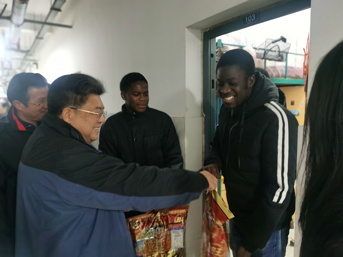 2月11日上午,新春佳节来临之际,安徽中医药大学副校长魏骅、校办主任聂久胜一行来到留学生公寓,看望慰问在校留学生,为他们送去节日的问候。学生处处长王红松、总务处处长胡波、保卫处副处长完茂林、护理学院副书记卞海、人文与国际教育交流学院副院长昂文平也陪同慰问。