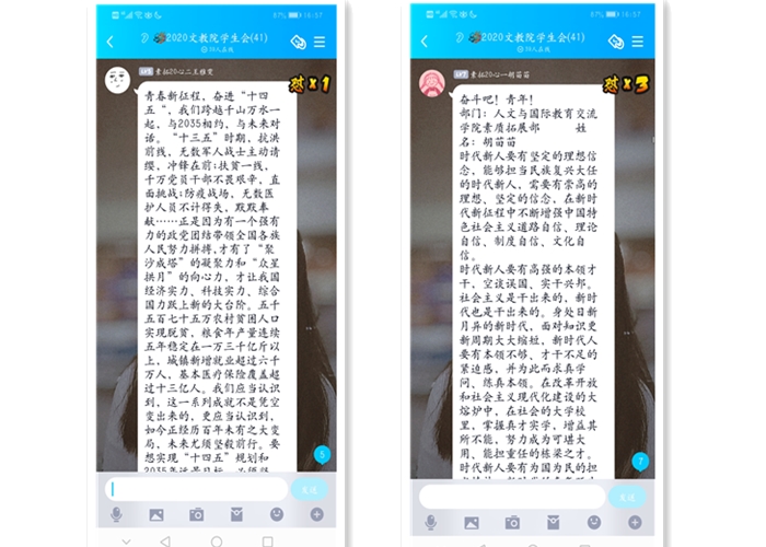 20级汉语国际教育班的王姚琦同学表示:青春新征程,与2035相约,与未来对话。作为一名大学生,更应对党绝对忠诚,以“功成不必在我,建功必须有我”的自觉担当,融入“两个一百年”奋斗目标中,逢山开路、遇水架桥,为中国的高质量发展,注入“新力量”。前路漫漫,我们定当携手再谱华章;岁月滚烫,我们必定齐心再创辉煌。