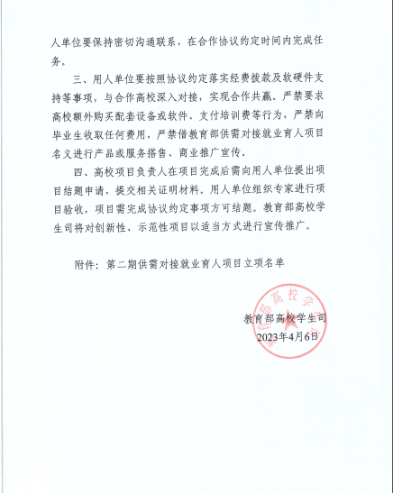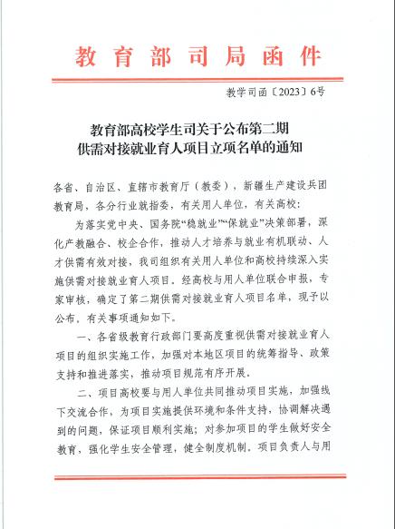 供需对接就业育人项目是教育部为落实党中央、国务院“稳就业”“保就业”决策部署,深化产教融合、校企合作,推动人才培养与就业有机联动、人才供需有效对接,由教育部高校学生司组织发起,有关用人单位和高校共同实施。项目经高校申请、用人单位申报、专家审核、立项单位信息核查,最终确定项目名单。