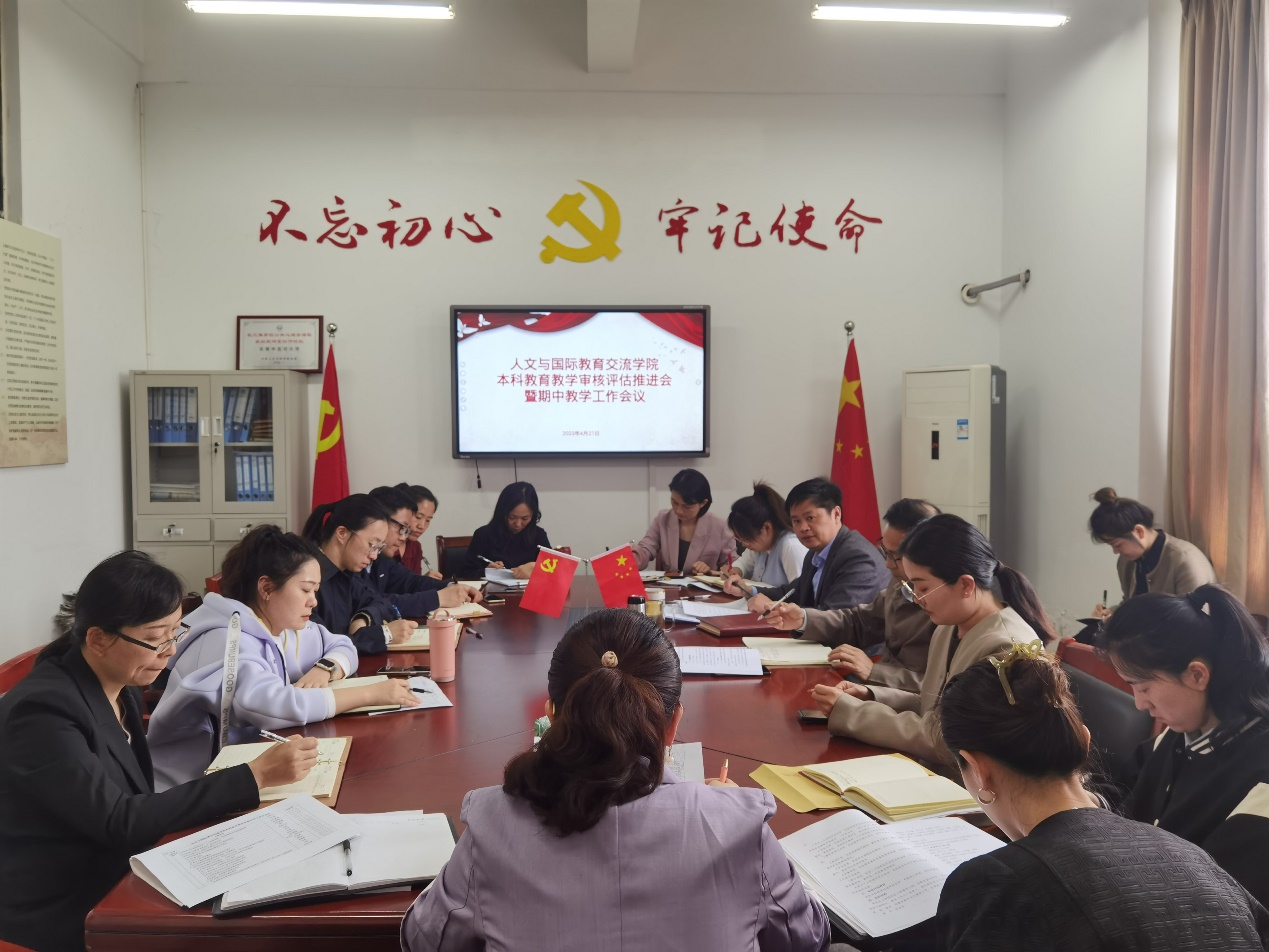4月21日下午,人文与国际教育交流学院在惟新楼471会议室召开本科教育教学审核评估推进会暨期中教学工作会议,学院领导、全体行政科室人员、各系(中心)主任参加会议,会议由学院副院长张筱荣主持。