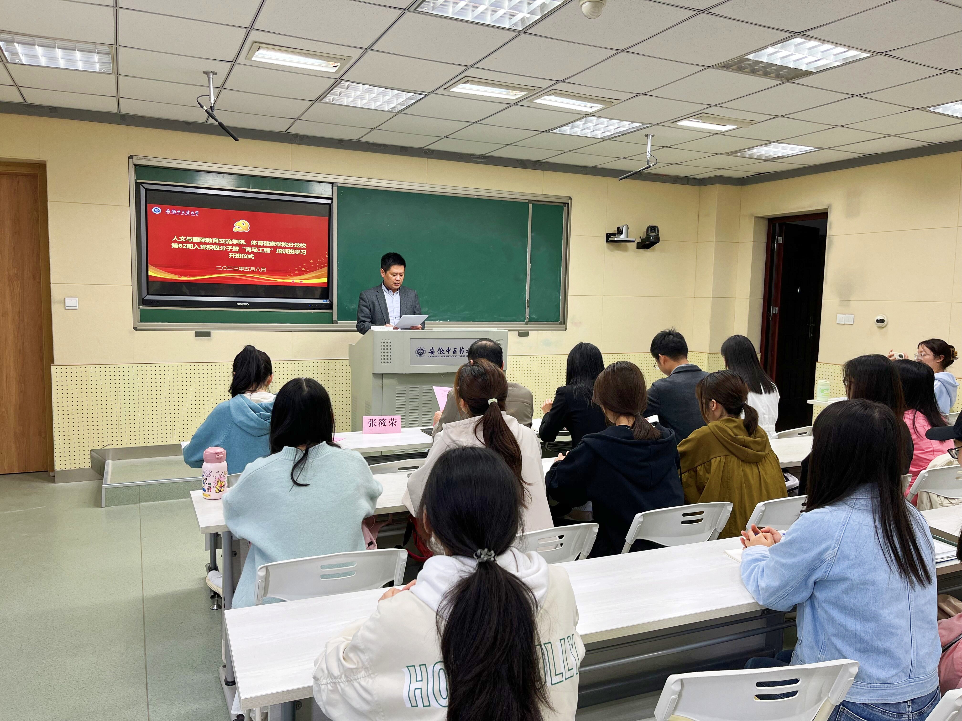 为深入学习宣传贯彻党的二十大精神,帮助入党积极分子提高思想认识、端正入党动机,5月8日下午,人文与国际教育交流学院、体育健康学院分党校2023年度上半年入党积极分子暨“青马工程”培训班在少荃湖校区惟新楼376室正式开班。人文与国际教育交流学院党总支副书记、院长周亚东主持开班式并做第一次专题党课。体育健康学院副书记、副院长程昭、人文与国际教育交流学院副院长张筱荣、学校组织部综合科科长王向阳应邀出席。学院辅导员、2023年度上半年院共70名入党积极分子参加开班式。
