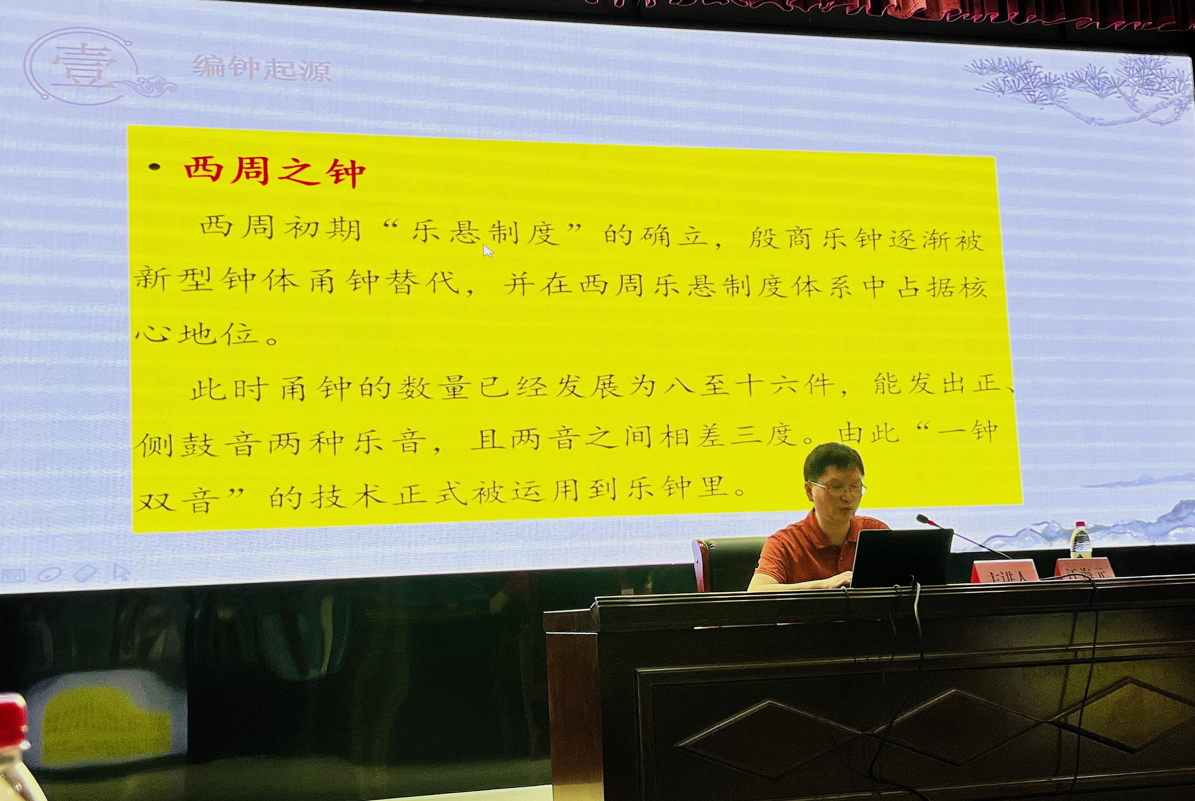 此次讲座,汪海元教授以编钟音乐文化为主题,首先从历史发展的角度分析了编钟的起源、发展及其演变过程;其次说明在中国古代礼乐制度中,编钟起着非常重要的作用,编钟作为礼乐制度的重要载体和标志,其形制的演变代表着礼乐制度的发展变化,可以说编钟是中国礼乐制度的核心。最后他结合历史和考古资料及大量图片从历史、文化、艺术等多个角度,深入浅出地为我们介绍了曾侯乙墓编钟、晋候苏编钟、海昏侯编钟等的文化内涵和历史价值。