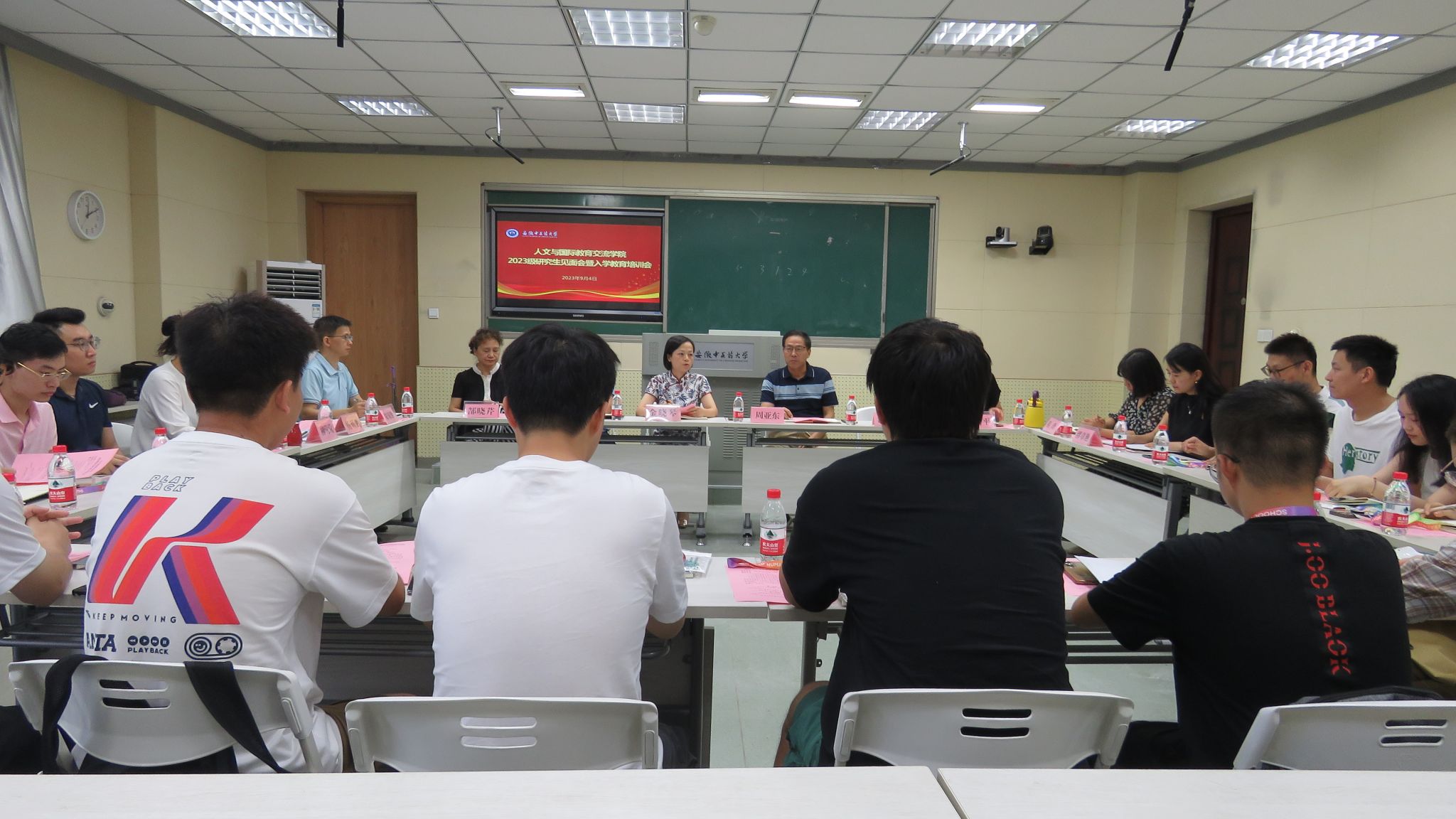 9月4日下午,人文与国际教育交流学院在惟新楼376室举行2023级研究生师生见面会暨入学教育专题培训,学院领导班子、学校研究生院综合科科长濮燕萍老师、全体硕士生导师、研究生辅导员出席活动,全体在校研究生同学参加了会议,会议由党总支书记金晓琴主持。
