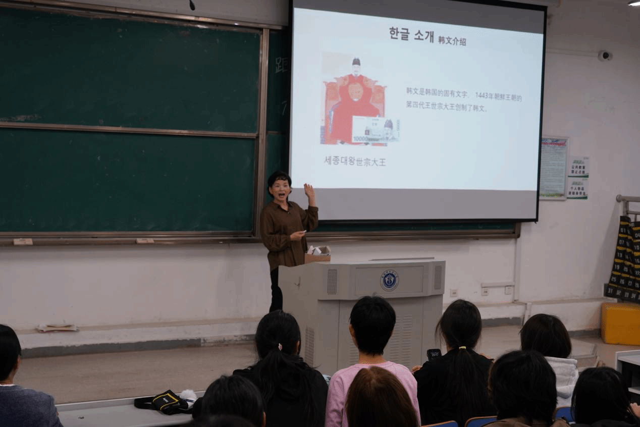 开班仪式结束后,赵诚美老师为所有同学开始本期韩国语培训班的第一课。她的亲切和幽默赢得同学们的阵阵掌声。