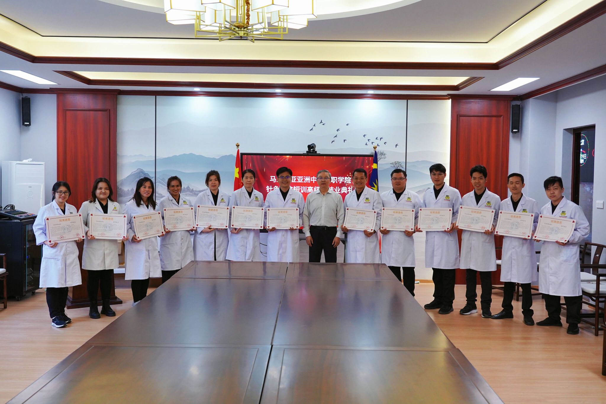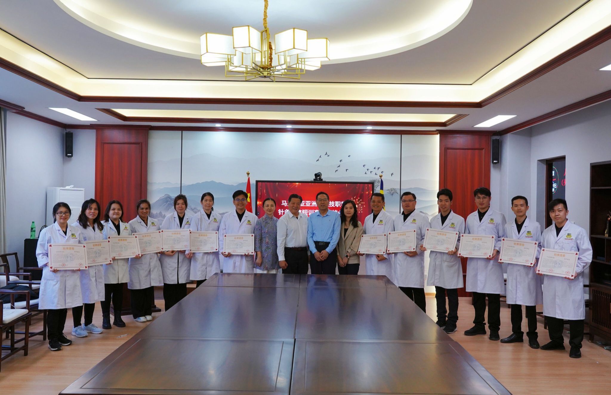 9月18日下午,马来西亚短训班学员顺利完成了为期一周的针灸推拿课程学习并顺利通过了结业考试,院长周亚东及培训教师代表陈朝晖教授为学员们颁发结业证书。