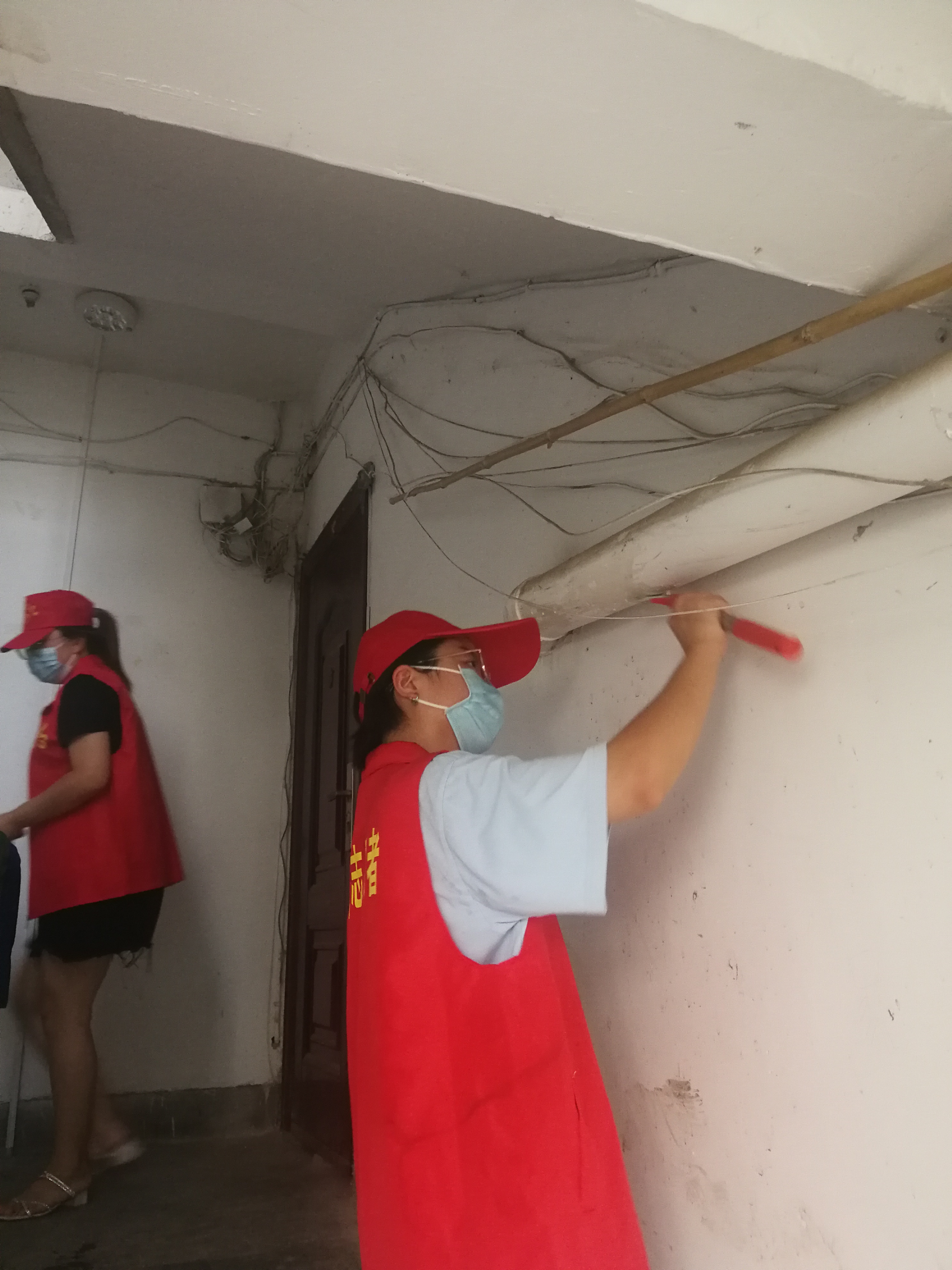 刚到社区报道,我接到的第一项任务就是参与社区大扫除,帮助居民清理楼道中的垃圾。机场社区是一个老旧小区,没有保洁人员进行定期的清洁,因此,楼道的墙壁、水管上,经常贴满了小广告,就需要社区的工作人员定期打扫。来到热火朝天的大扫除现场,我看到参与大扫除的每一位工作人员都是汗流浃背,但是干活的速度丝毫不减。大概三四个小时之后,工作结束的大家在楼下合影留念时,才发现每一位叔叔阿姨的衣服都几乎完全被汗水湿透。