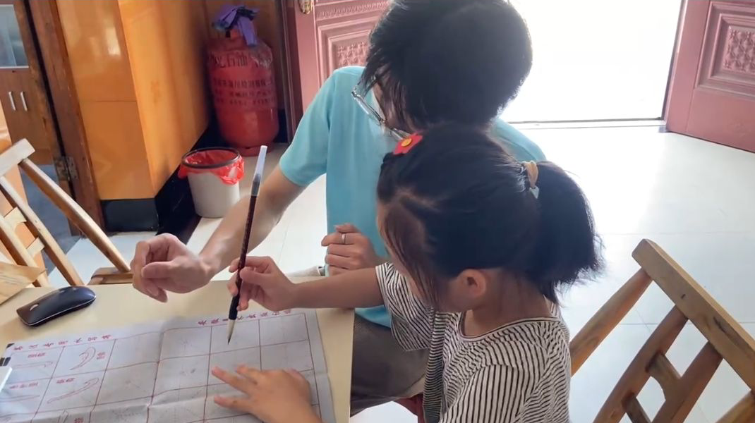 实践团成员带领小女孩学习中国优秀传统文化——书法,讲解文房四宝,学习毛笔的握笔姿势及运腕等相关知识,并在水写布上练习。赵永菁学得很认真,展现出浓厚的兴趣