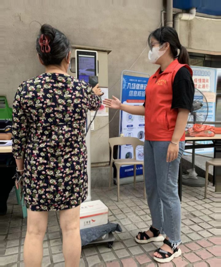 2.参与社区疫情防控工作,亲身体验实践过程。在7月7日至7月15日期间,实践队员加入到深圳市南山区沙河街道明珠社区的志愿服务队中,主要负责工作任务是在由社区负责的小区门口前,配合保安监督每一个进入小区的人打开粤康码,对准指定的机器进行扫描,在扫描后,持有24小时核酸证明、体温正常且为白名单(即小区已于物业管理处登记后的居民住户会在系统内显示为白名单)的住户可以进入小区内。若无24小时核酸证明需要求其到任意核酸检测点去检测,或提供核酸检测中的截图页面方可通行;若是非白名单住户或是外来人员,需于物业管理处登记并提供行程码,才方可进入小区内。