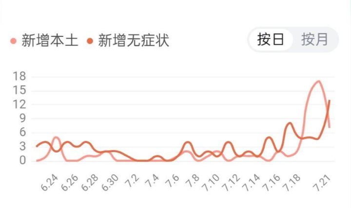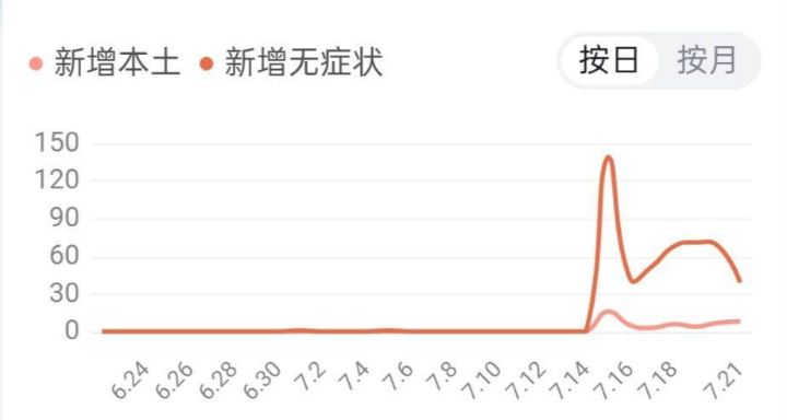 1.查阅相关新闻资料,了解蚌埠市疫情现状。通过事先查阅深圳市当前疫情的最新消息情报及相关资料新闻并结合疫情动态趋势图的新增本土趋势图和新增无症状趋势图二者,截止至7月21日0时,我们可以看见,在7月15日之前,较为稳定无新增病例,但15日起往后,病例人数急剧增加,呈现指数增长趋势,不过后期新增减少,呈缓慢增长趋势,逐渐趋于稳定。