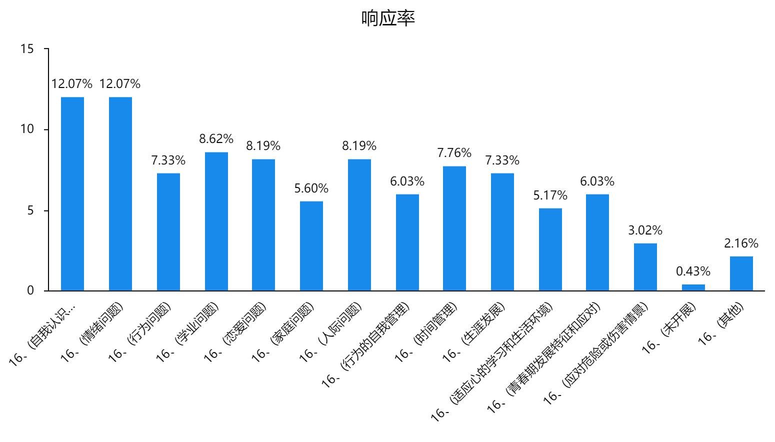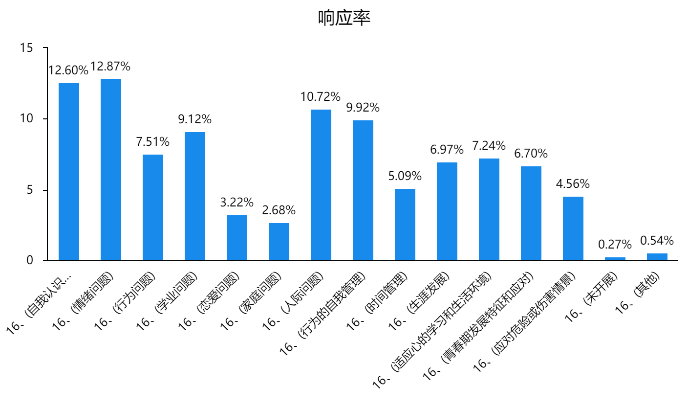 选项:自我认识与接纳、情绪问题、行为问题、学业问题、恋爱问题、家庭问题、人际问题、行为的自我管理、时间管理、生涯发展、适应心的学习和生活环境、青春期发展特征和应对、应对危险或伤害情景、未开展、其他。