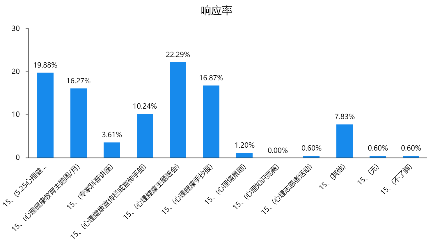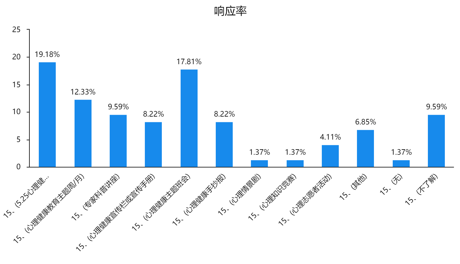 选项:5.25心理健康节、心理健康教育主题周/月、专家科普讲座、心理健康宣传栏或宣传手册、心理健康主题班会、心理健康手抄报、心理情景剧、心理知识竞赛、心理志愿者活动、其他、无、不了解。