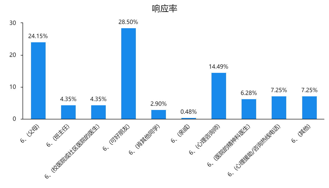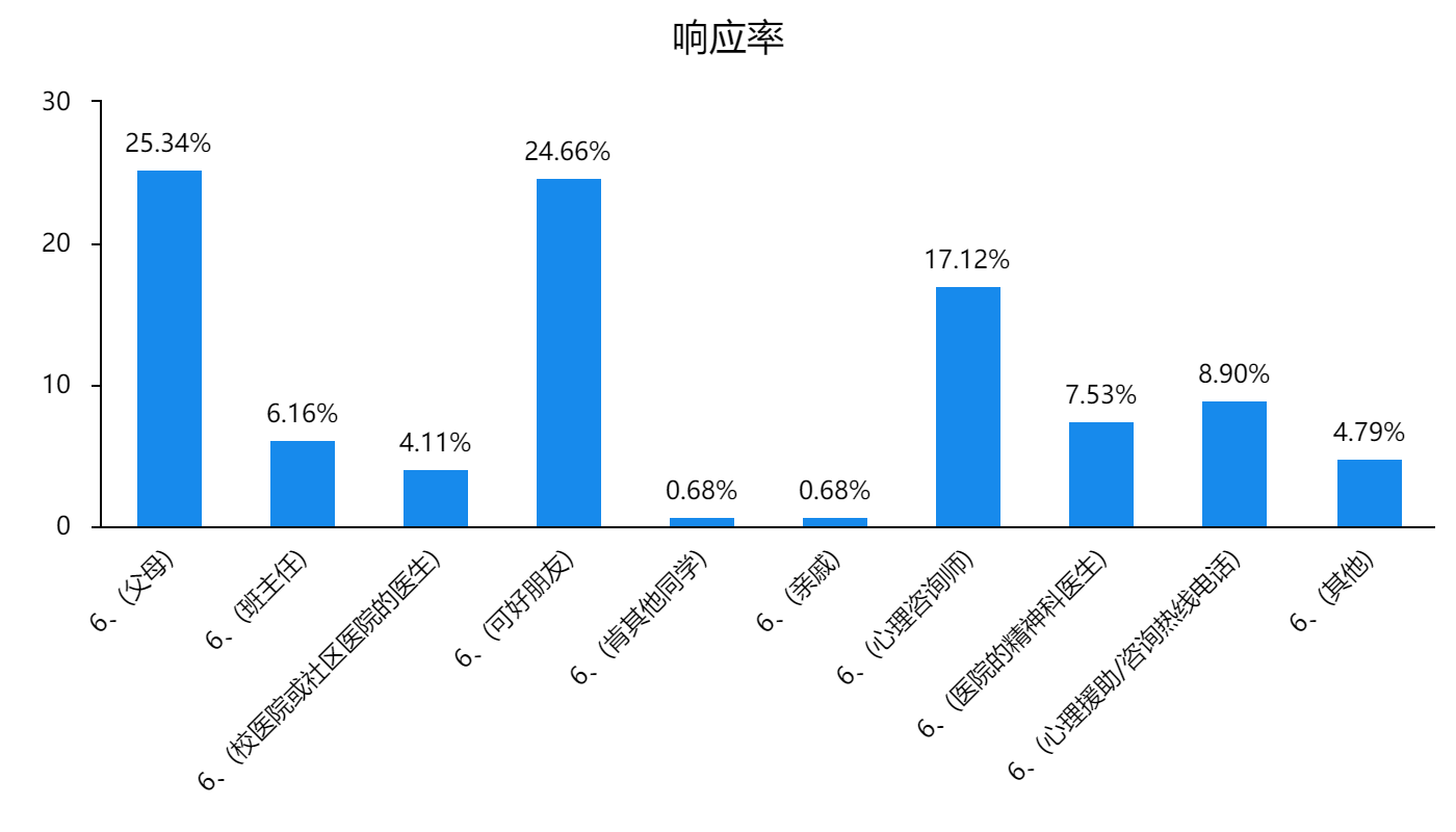 选项:父母、班主任、校医院或社区医院的医生、好朋友、其他同学、亲戚、心理咨询师、医院的精神科医生、心理援助、咨询热线电话、其他。