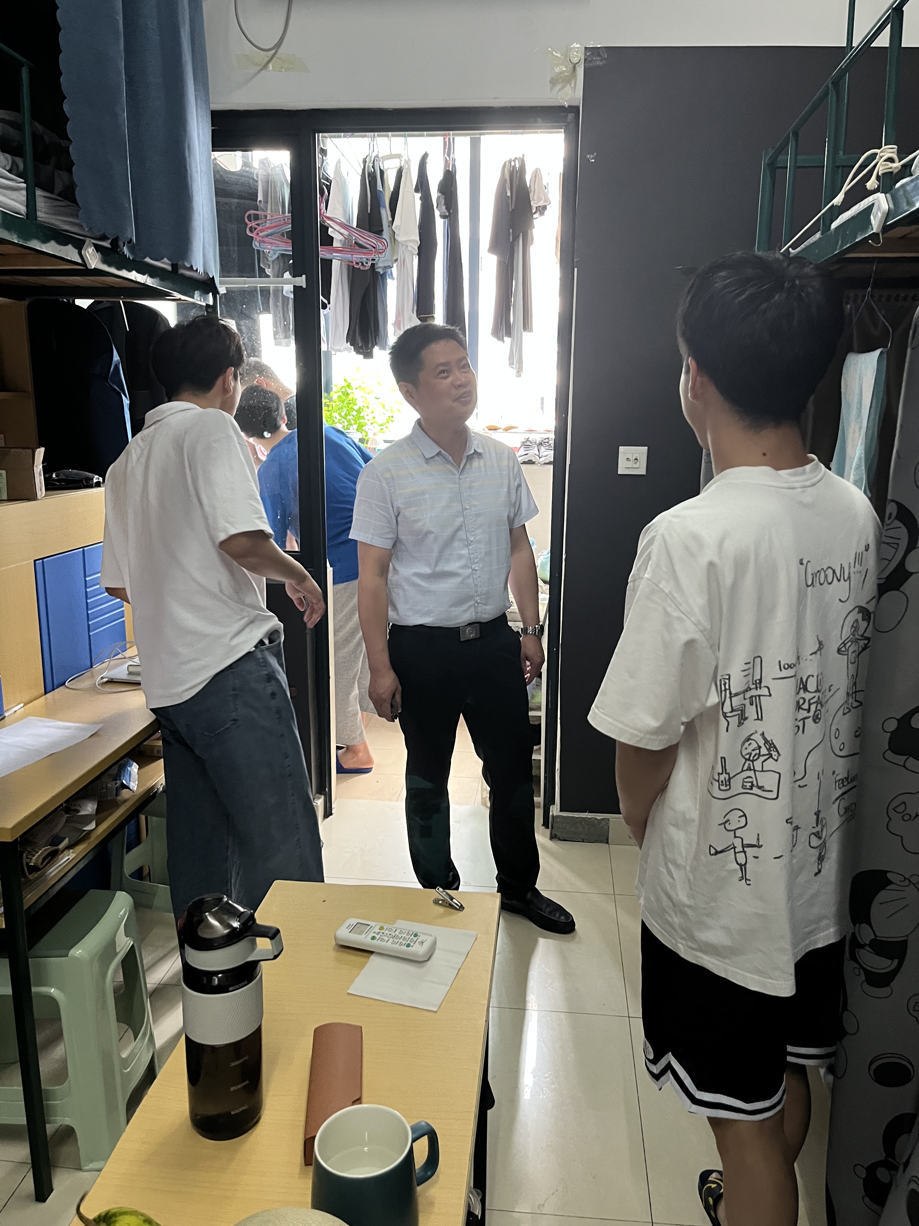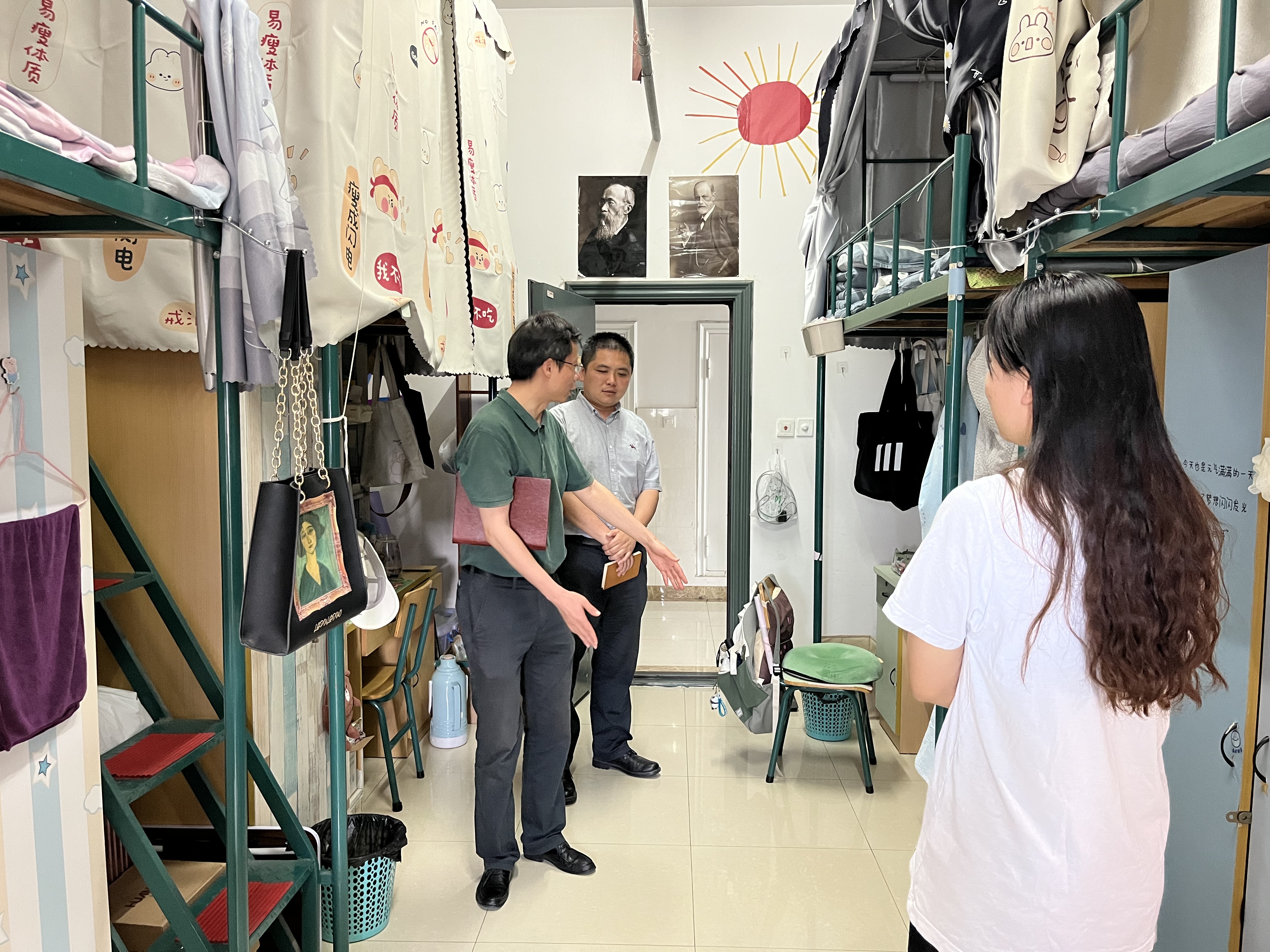 学生处副处长张扬,人文与国际教育交流学院党总支副书记桂大鹏、副院长张筱荣,带领学院全体值班辅导员检查走访学院学生宿舍。在走访和过程中耐心倾听了同学们对于学院的意见建议和问题诉求,提醒同学们提高安全防范意识,做好个人健康防护、预防电信诈骗,科学规划复习安排,诚信考试。