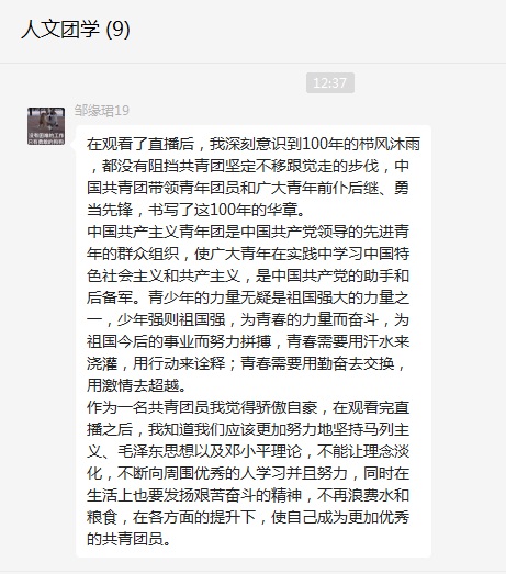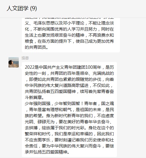 人文与国际教育交流学院分团委学生会主席、2019级应用心理学(1)班张亚茹同学表示,青年犹如大地上茁壮成长的小树,自古英雄出少年。青年人就该做青年人的事,努力学习,不负时代的和人民期望和重托。2022年是我们共产主义青年团建团100周年,作为一名青年,我一直在为自己的梦想奋斗。作为一个中国人,我更坚信,我的梦想应该与祖国的梦想结合起来,以国家为主个人为辅,唱响青春之歌。在中国共青团一百周年诞辰之际,我们也应拿出最好的状态和最⾼的热情,为中国共青团庆生。作为新时代的青年,我们应肩负起历史赋予我们的使命,努力学习,积极奋斗,奋发图强,一起去书写美好的未来篇章。